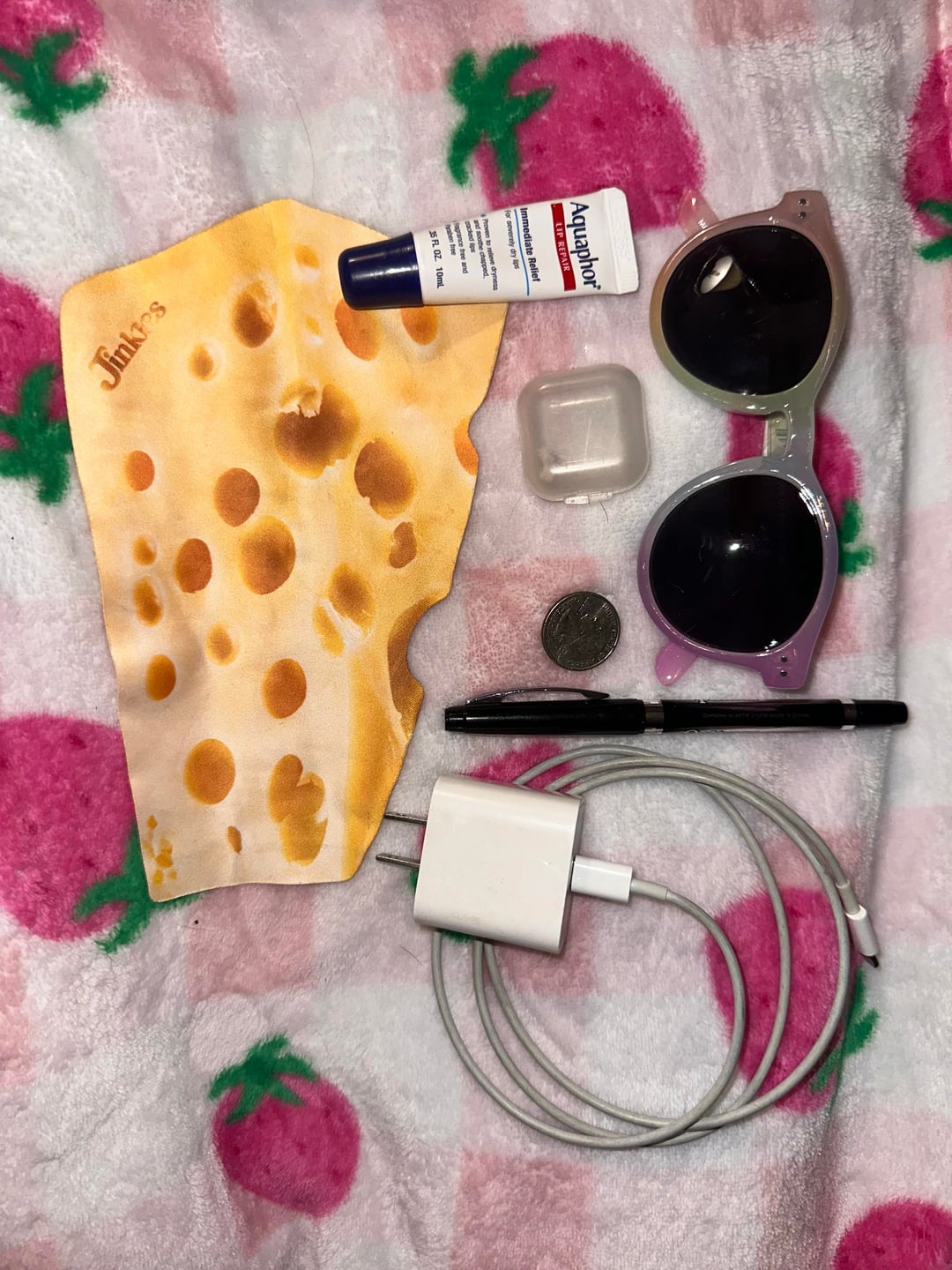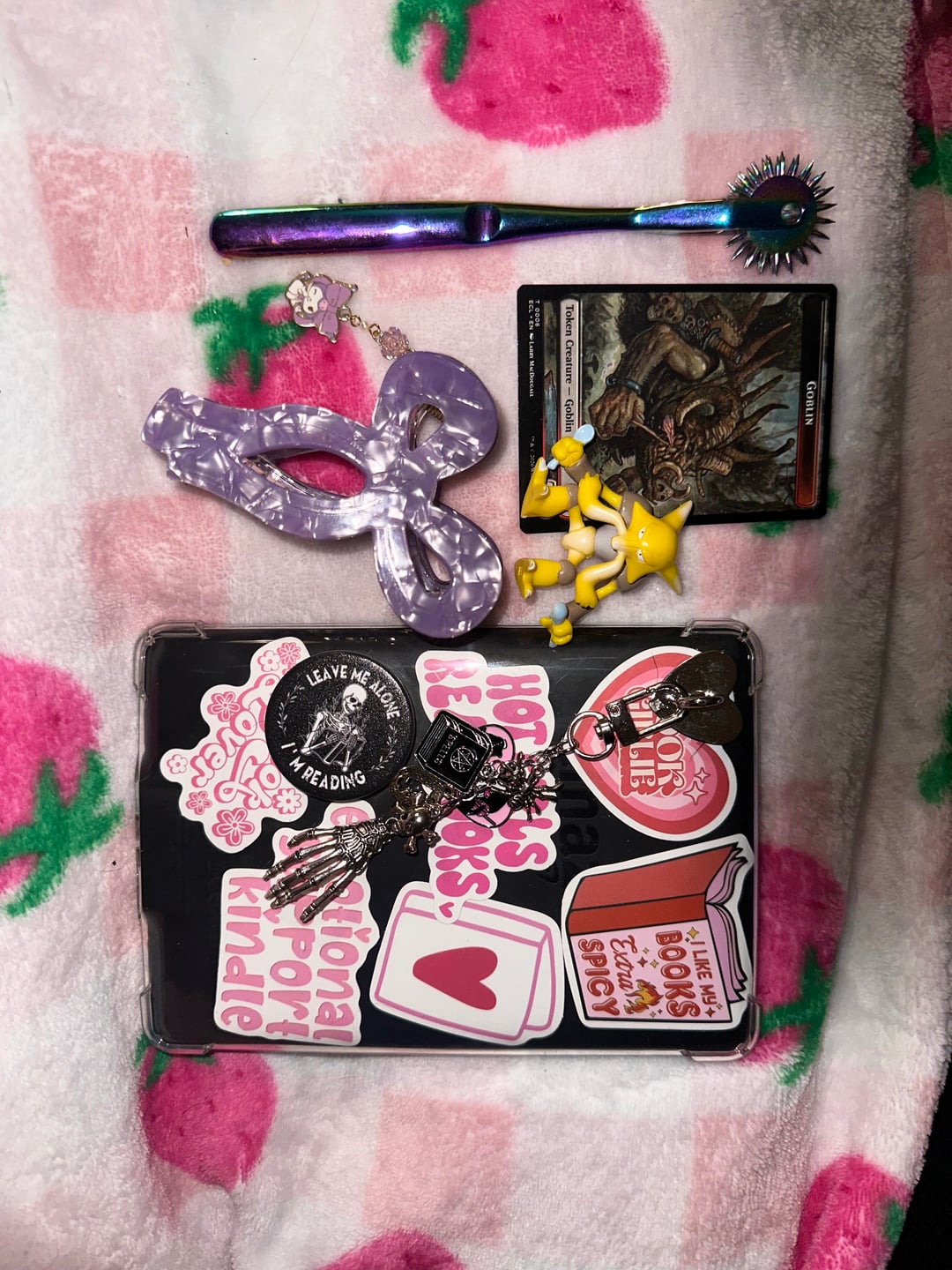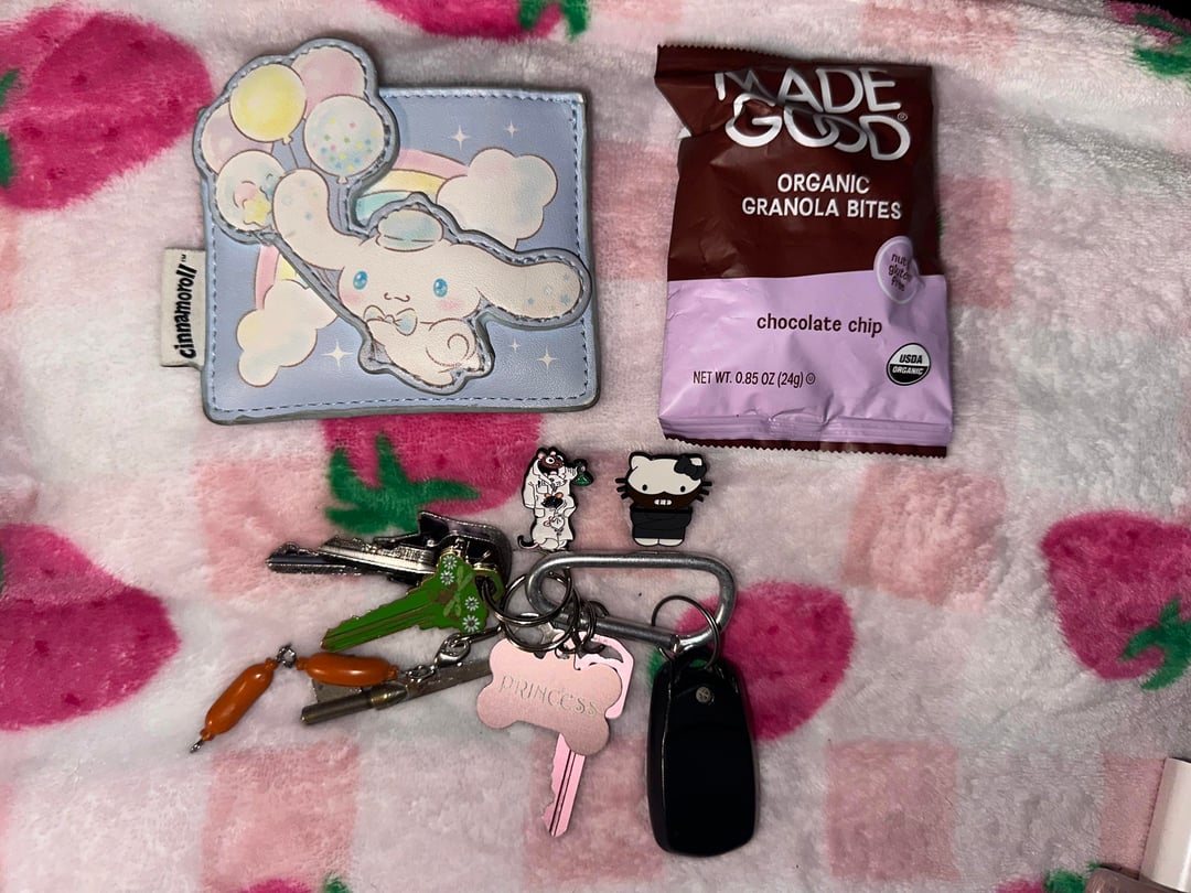 Wurtenburg wheel, goblin token, Kuromi hair clip, Alakazam figure, Kindle, glasses cleaning cloth, dog tooth, sunglasses, phone charger pen, Aquaphor, wallet, snack, pins keys, hand, lotion, handgun (Taurus 650 3”), girly things, Band-Aid, pouch, medicine, hair tie and Allen key