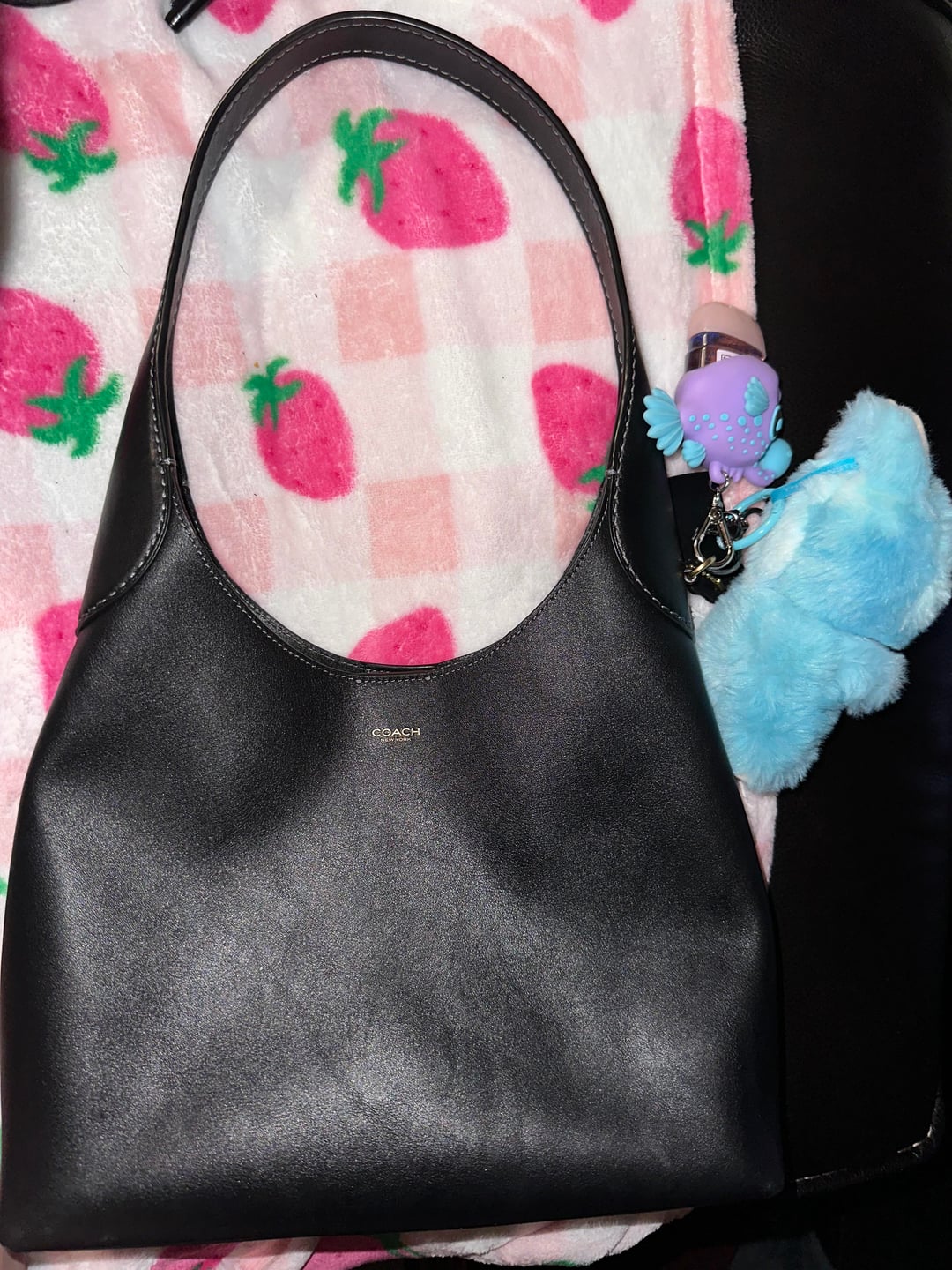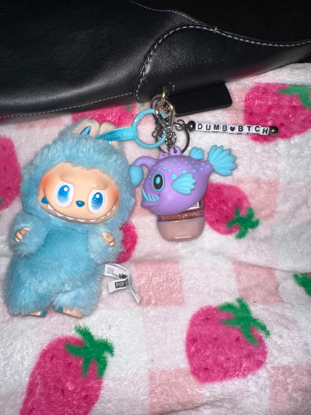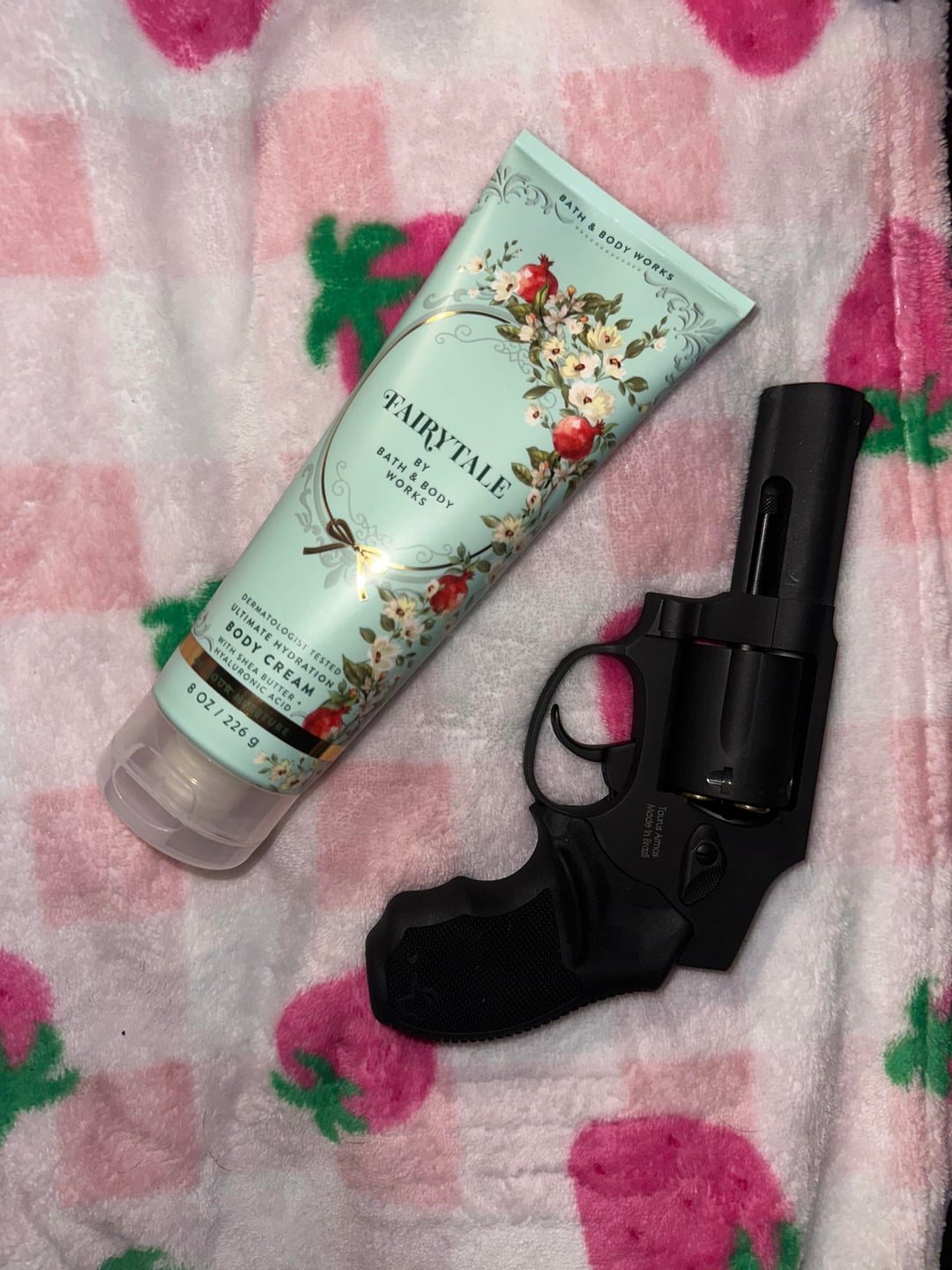 Wurtenburg wheel, goblin token, Kuromi hair clip, Alakazam figure, Kindle, glasses cleaning cloth, dog tooth, sunglasses, phone charger pen, Aquaphor, wallet, snack, pins keys, hand, lotion, handgun (Taurus 650 3”), girly things, Band-Aid, pouch, medicine, hair tie and Allen key