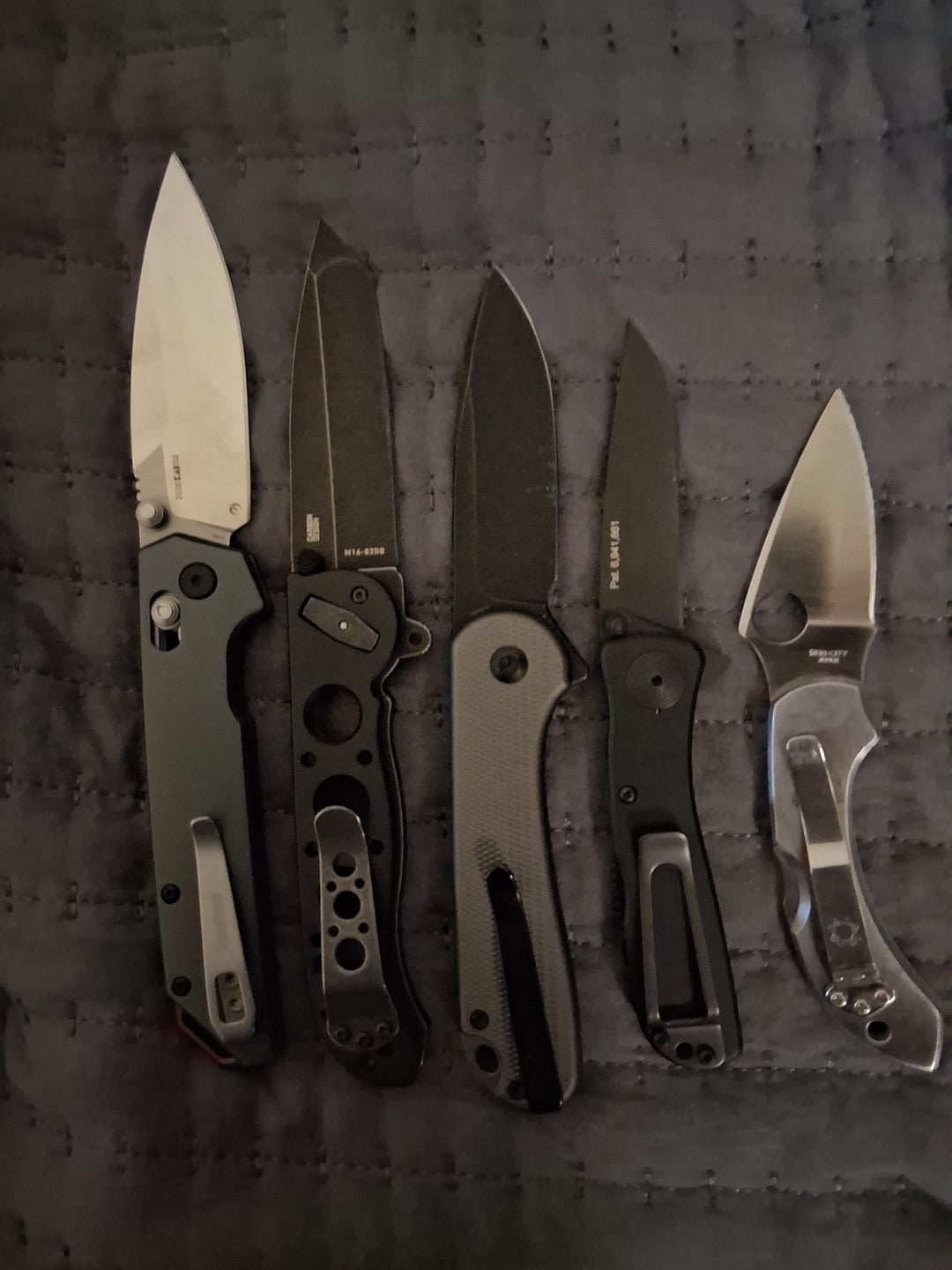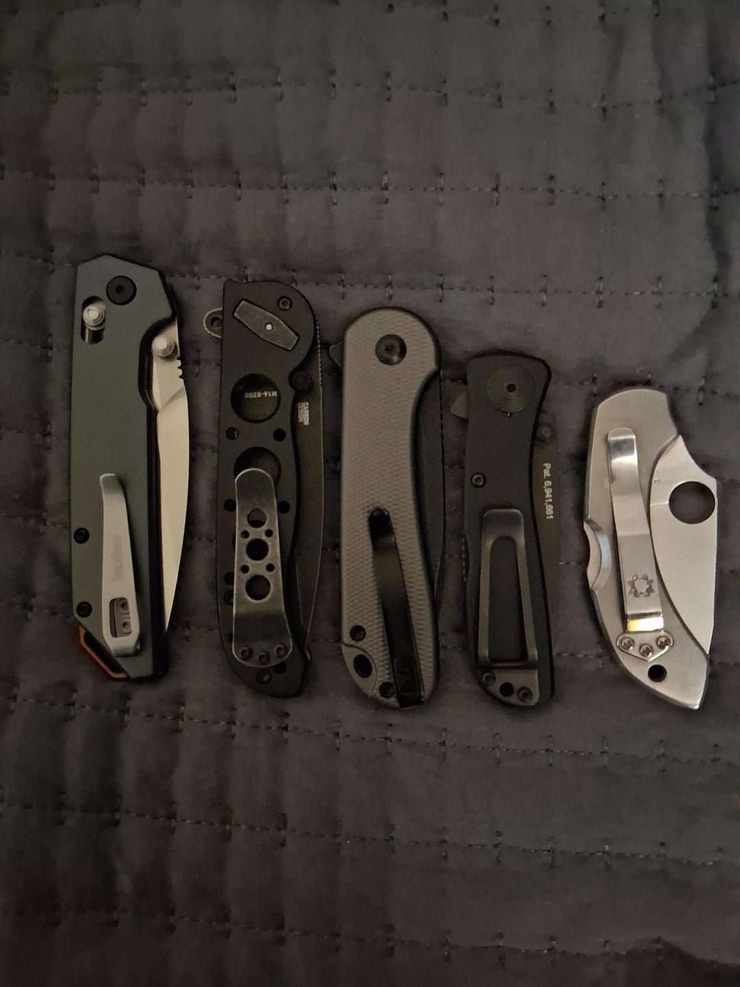 Sorry should of labeled what I had Kershaw irridium CRKT m-16 Civvi Elementium ll Sog twitch ll and a spyderco dragon fly.