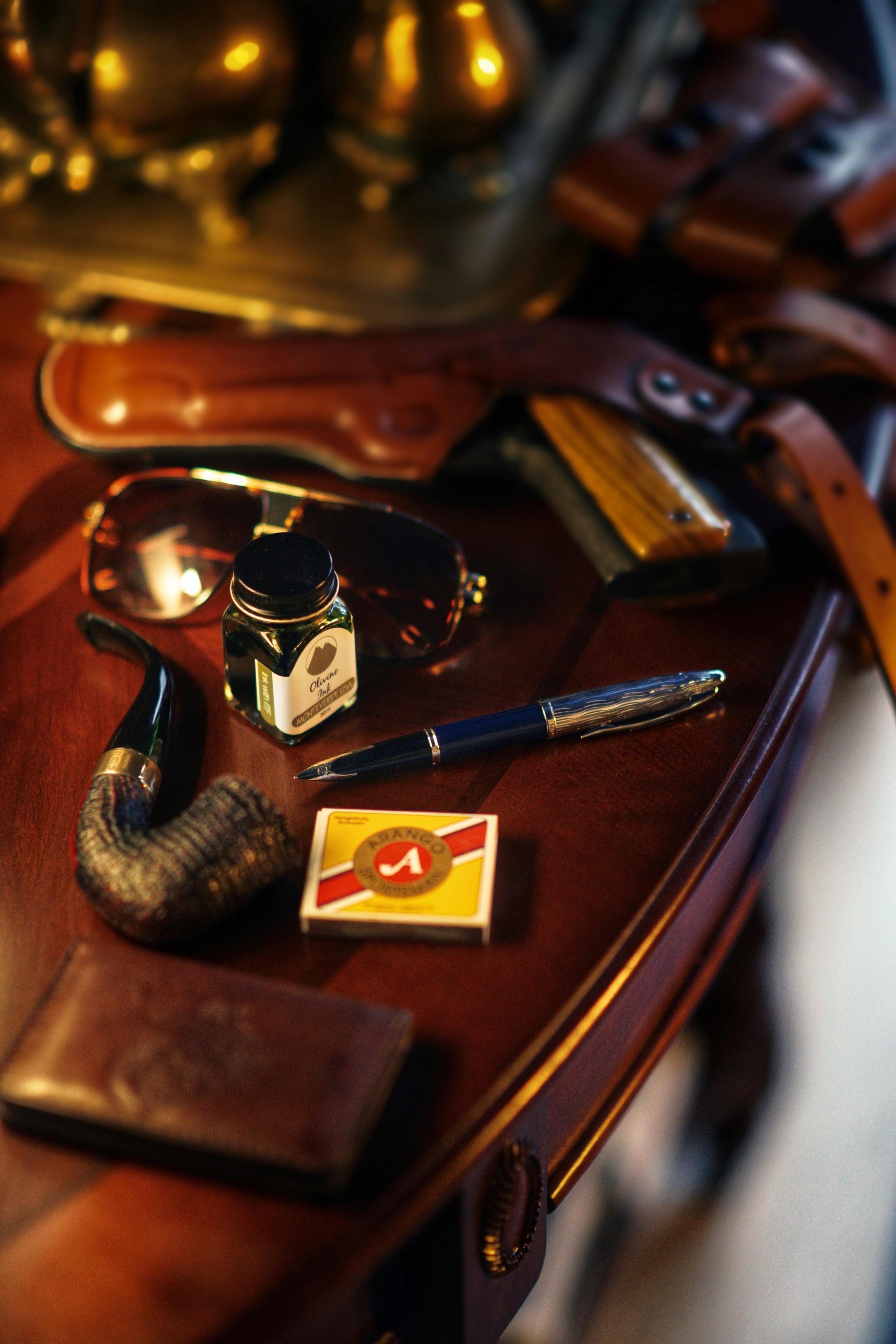 1. Waterman Carène fountain pen 2. Monteverde Olivine ink 3. Peterson Sherlock Original PSB 4. Colt 1911 Government 5. Armadillo Leather shoulder holder 6. Gas station sunglasses 7. State Fair leather wallet