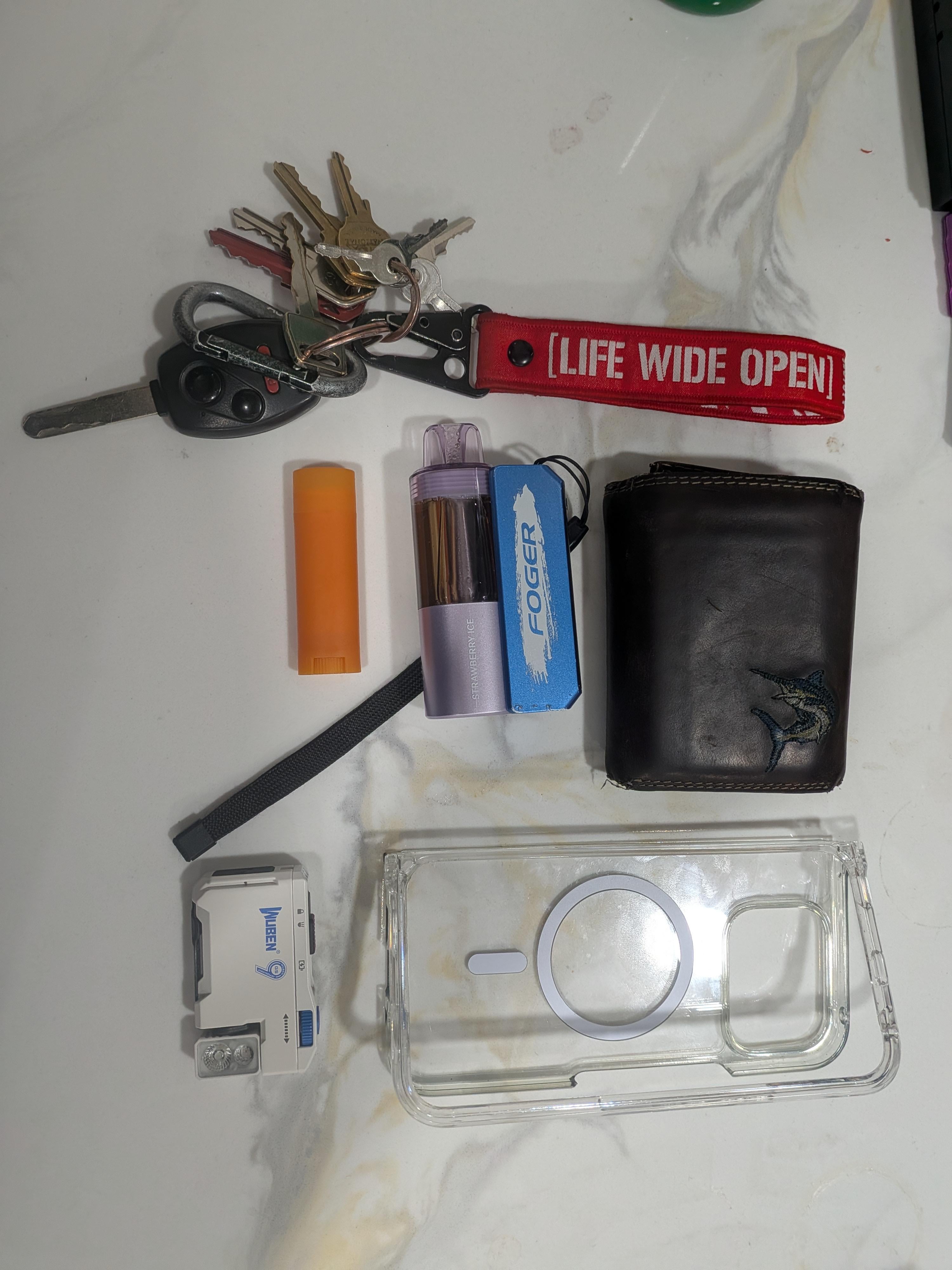 I see y'all with you crazy and expensive carries mines simple I got keys, vape, okeefes chapstick, wallet, my pixel 10 pro fold, and a wuben g9 flashlight.