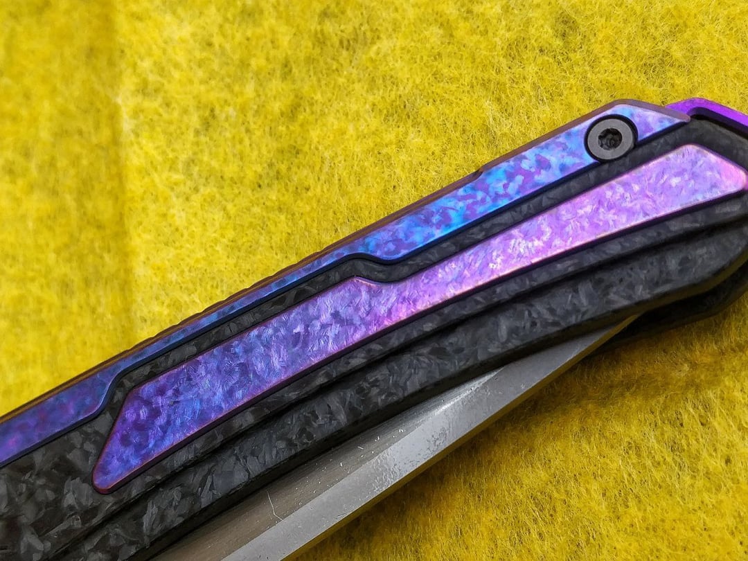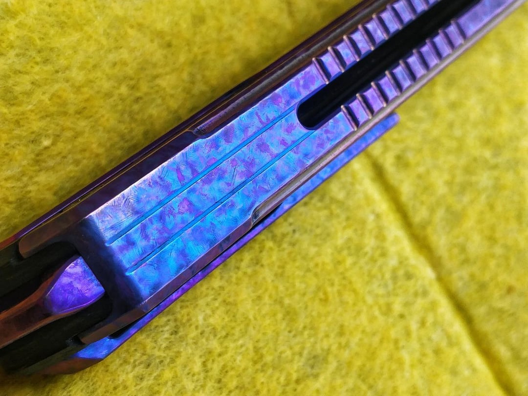 But sometimes children have to pay the sins of their fathers, so I sent the new Kestrel to be dremel-tortured by my friend, who made a few dozen amazing upgrades for me. It was long before CrystalTi was mass produced for knives, so the pseudo-crystal surface he made was certainly rare. The big subframe was made of steel and gave us a headache in attempts to match the texture and the gamma of titanium parts. At the end of the day, the ensemble was complete – now the vivid purple colors of pseudo-CrystalTi match with chaotic shredded carbon of the handle.