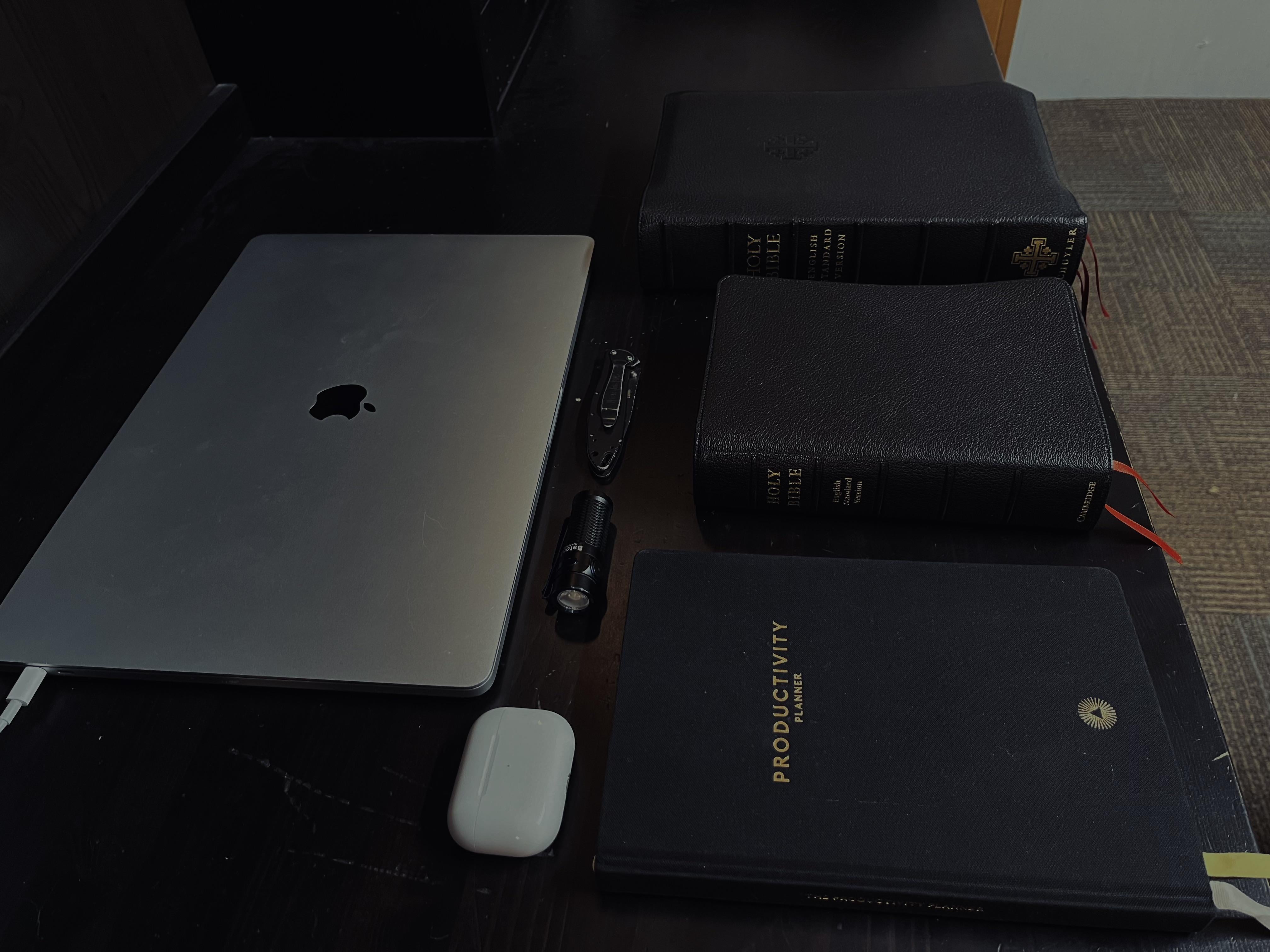 austin-bachert 1 month ago – Schuyler ESV Wide Margin Quentel – Cambridge ESV Clarion – Intelligent Change Productivity Planner – Kershaw Leek – OLight Baton 3 – AirPods Pro – MacBook Pro