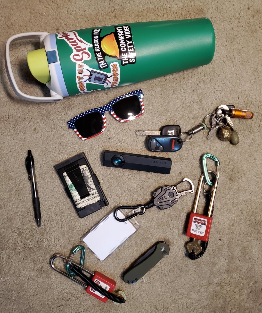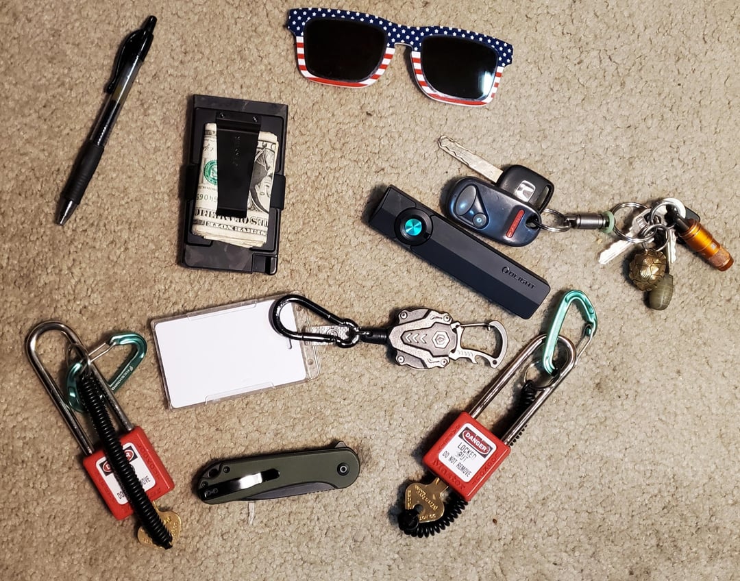 This is my everyday work carry 2 lotos, Id holder / retracter, civivi elementum 2, olight arkpro with cool light, my forged carbon fiber esker wallet, keys for the whip, pen for work orders, and sunnys for my glasses. If anyone is curious about something let me know.