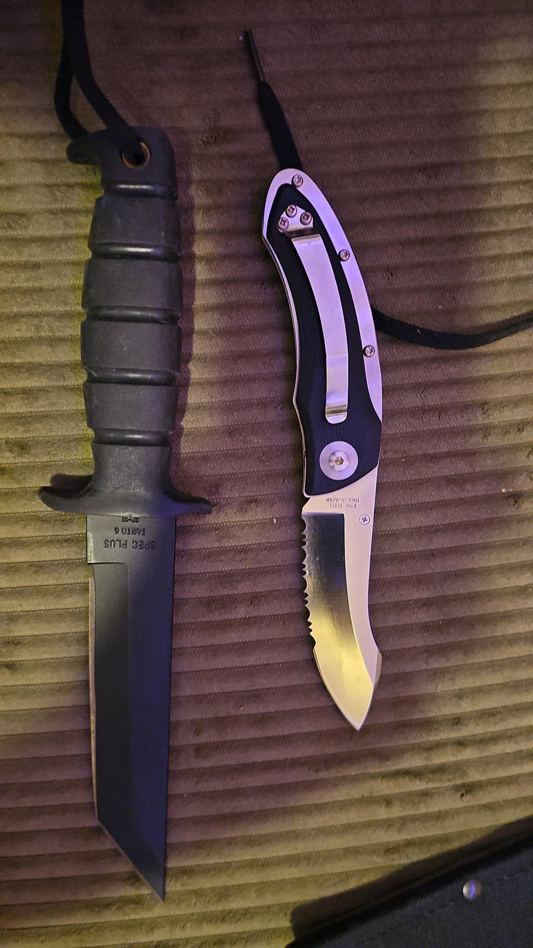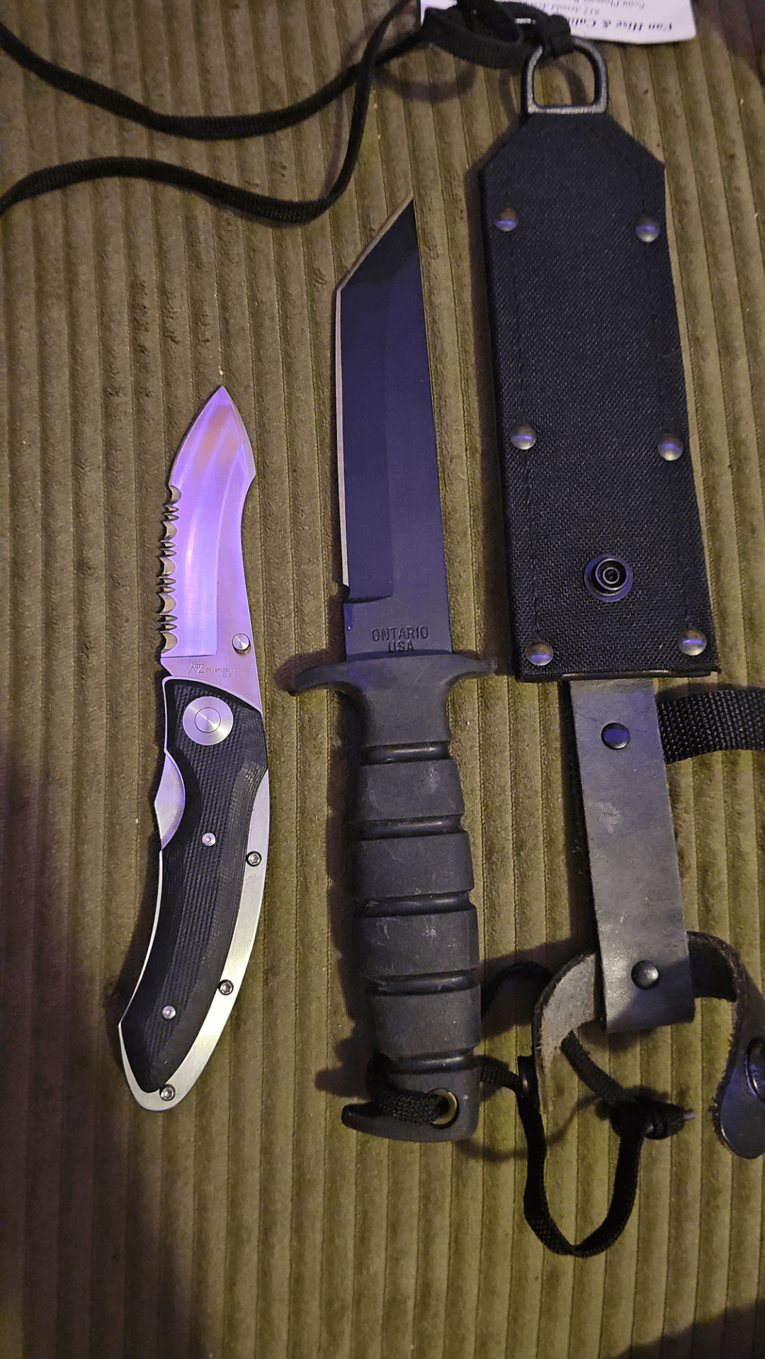 My newest knives is the KATZ and ONTARIO tanto. I never heard of the KATZ company, but im glad I got it. I love how the handle feels. It's not that hard plastic I think G10 scales, sorry if I butchered that, but these ones are softer like rubber. My other EDC is my bag knife. It stays with my gun and only comes out if needed. No I don't carry it in my pocket, besides that im happy with these 2 so far.