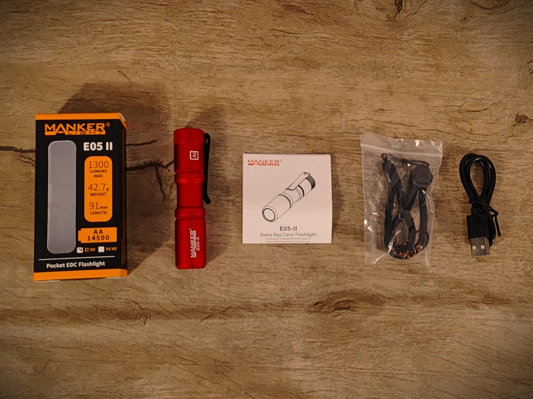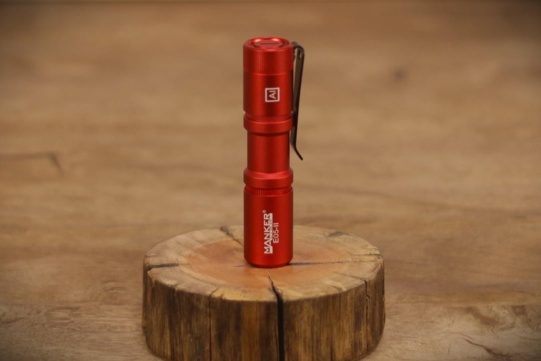 This is the E05 II, mini flashlight made by Manker, it is powered by a single 14500 or AA cell, it has a single non-specified 6500K LED. It has a black pocket clip and a tritium slot. It also features USB-C charging on the battery and AA compatibility.