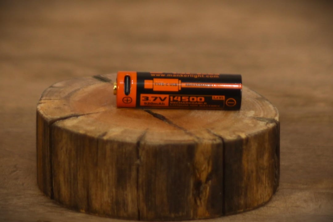 A Manker branded 900mAh 14500 Li-ion battery with USB-C charging is included on the package. [12th picture]