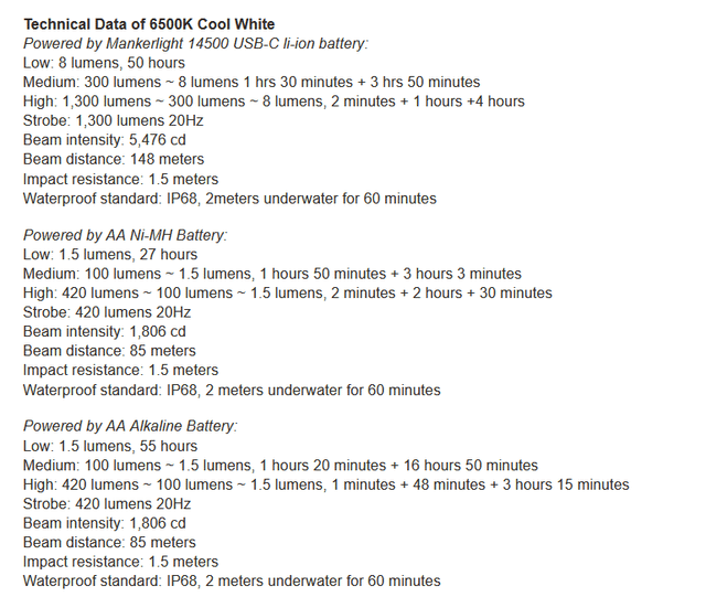 • Modes, Runtimes, Throw, Candela: I will include a picture of Manker's official info so you can take a look at it. [15th picture]