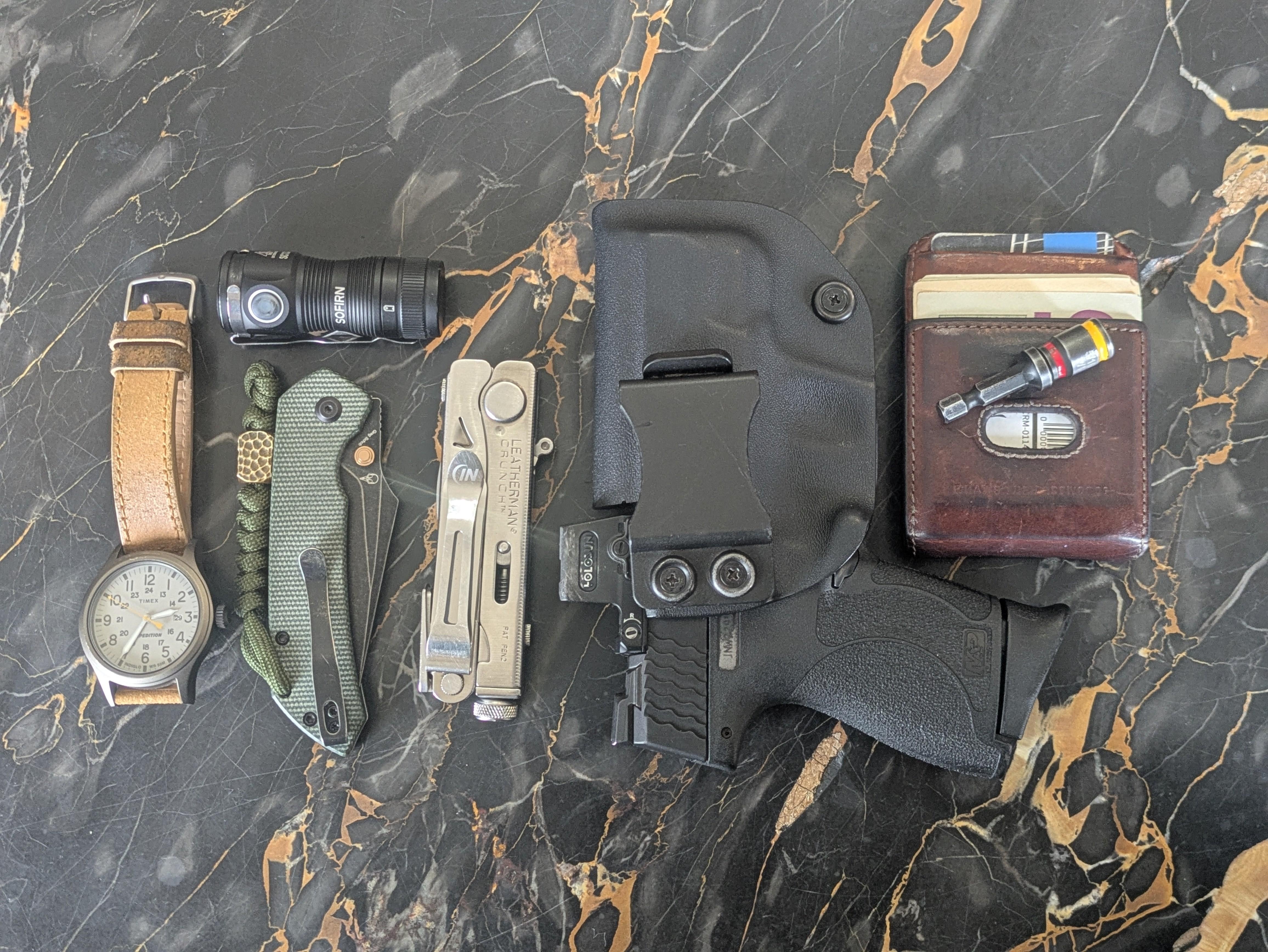 In EDC Today’s carry. January 28, 2026 Timex Expedition, Tenable Fenrir, Sofirn SC13A, Leatherman Crunch w/ Niteize clip, Shield Plus w/ Holosun EPS carry, Fossil Andrew wallet, Malco flip bit. by GhostEpstein EDC Prev Post Rockstead back from Japan for a repair to a chipped tip January 28, 2026 Next Post Today’s carry January 28, 2026 Related Posts EDC of a west german citizen January 31, 2026 Weekend Carry January 31, 2026 Guess what i do by my EDC January 31, 2026 1 Comment AutoModerator 3 days ago Thank you for posting to r/EDC! Include a detailed item list (make/model) within **1 hour** of submission. Lists can go in the title, a comment, or the image. Posts without lists will be removed. If you have already provided a list, not further action is needed, thanks | [FAQ](https://www.reddit.com/r/EDC/wiki/faq)*I am a bot, and this action was performed automatically. Please [contact the moderators of this subreddit](/message/compose/?to=/r/EDC) if you have any questions or concerns.*Write A CommentYou must be logged in to post a comment.