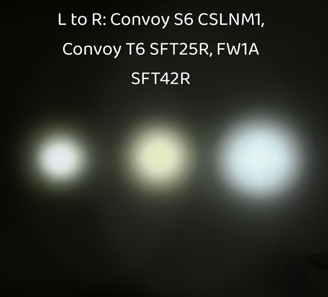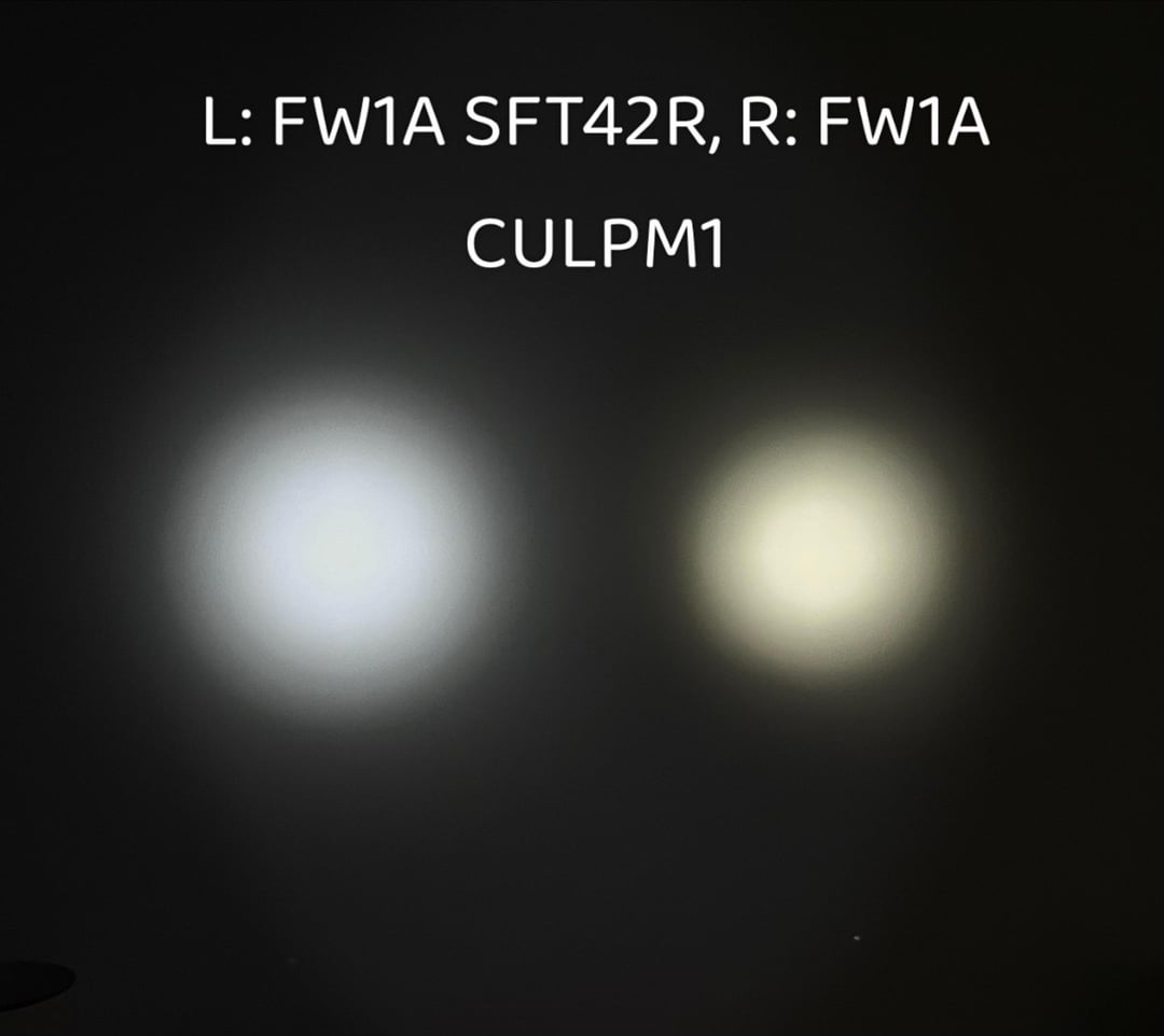 I also measured some other lights while I was at it, the FW1A with CULPM1 on a Sony VTC6 still edges out the SFT42R but the beam is a lot narrower so I prefer the SFT42R