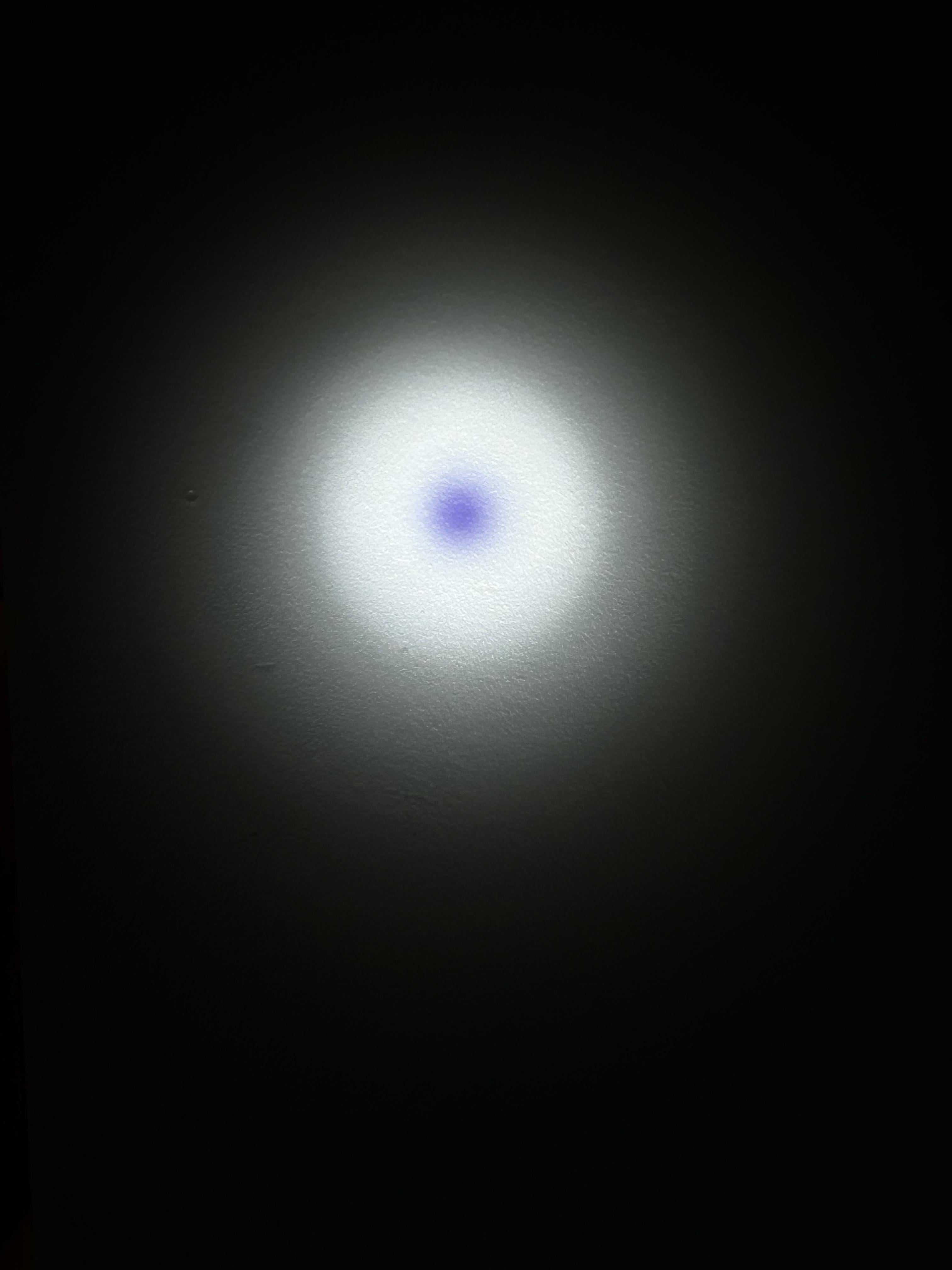 The light is brand new, charged the battery in the light using USB-C. Turned it on, flood modes are fine, throw mode was fine, then I hit turbo, and a purple spot appeared instantly in the middle of the hot spot. It's still there in lower modes now, so I suspect it overdrove the emitter and burned off phosphor in the middle.