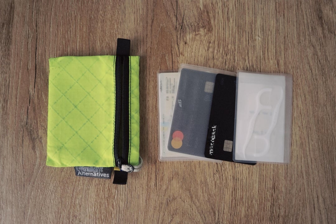 • Neon green pouch – wallet with driver’s license, a few cards, some cash, band-aids and toothpicks.