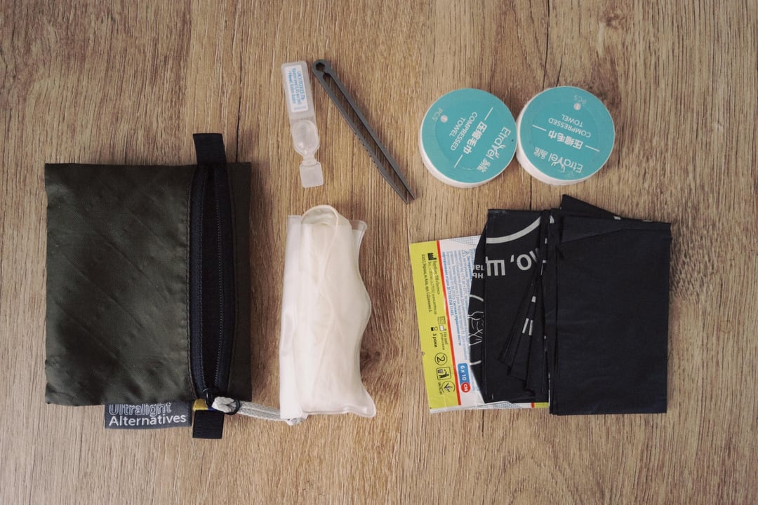 • Dark green pouch – emergency dog poop kit: dry towels, extra bags, silicone gloves, disinfecting wipes, tweezers and eye drops for nasty surprises.