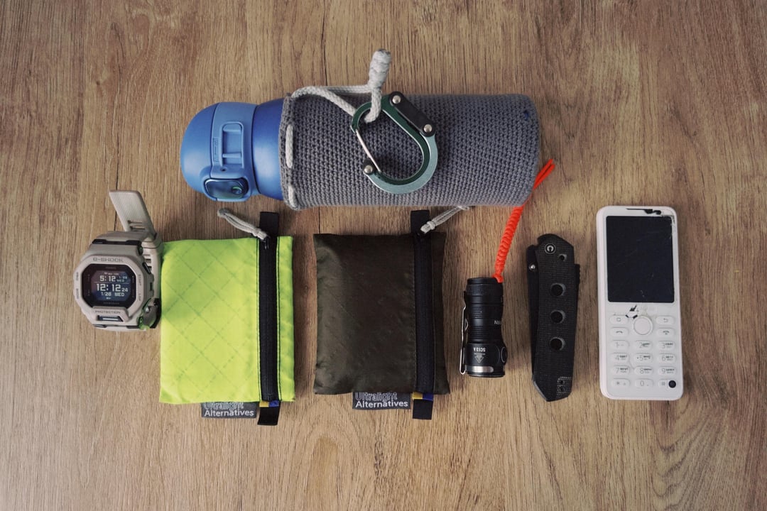 In summer everything lives in a first-gen Aer Day Sling that I wear as a fanny pack. In winter it all just migrates into my jacket pockets.