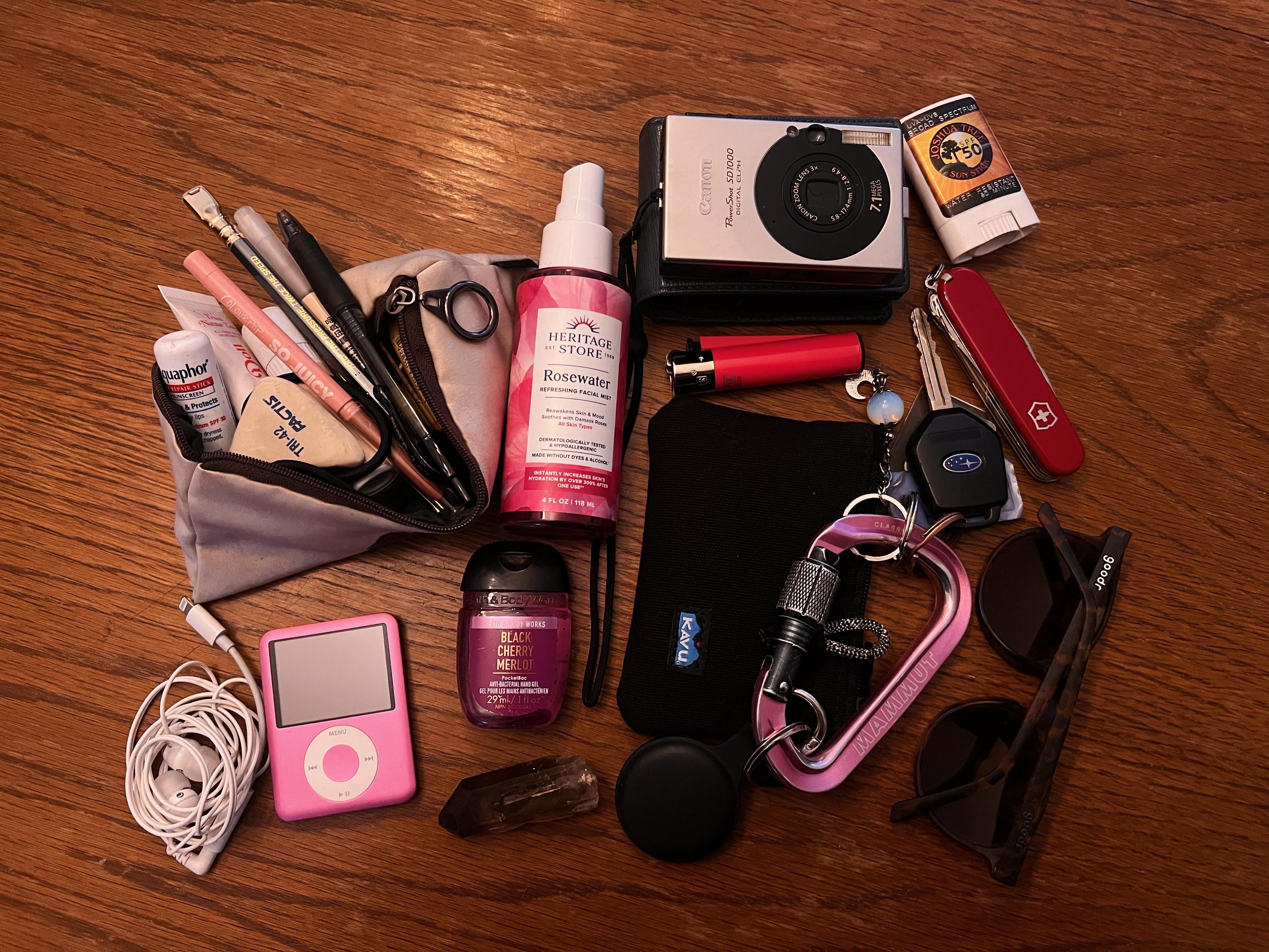 misc: smoky quartz crystal, heritage store rosewater, joshua tree sunscreen stick, swiss army knife and clipper lighter !!!