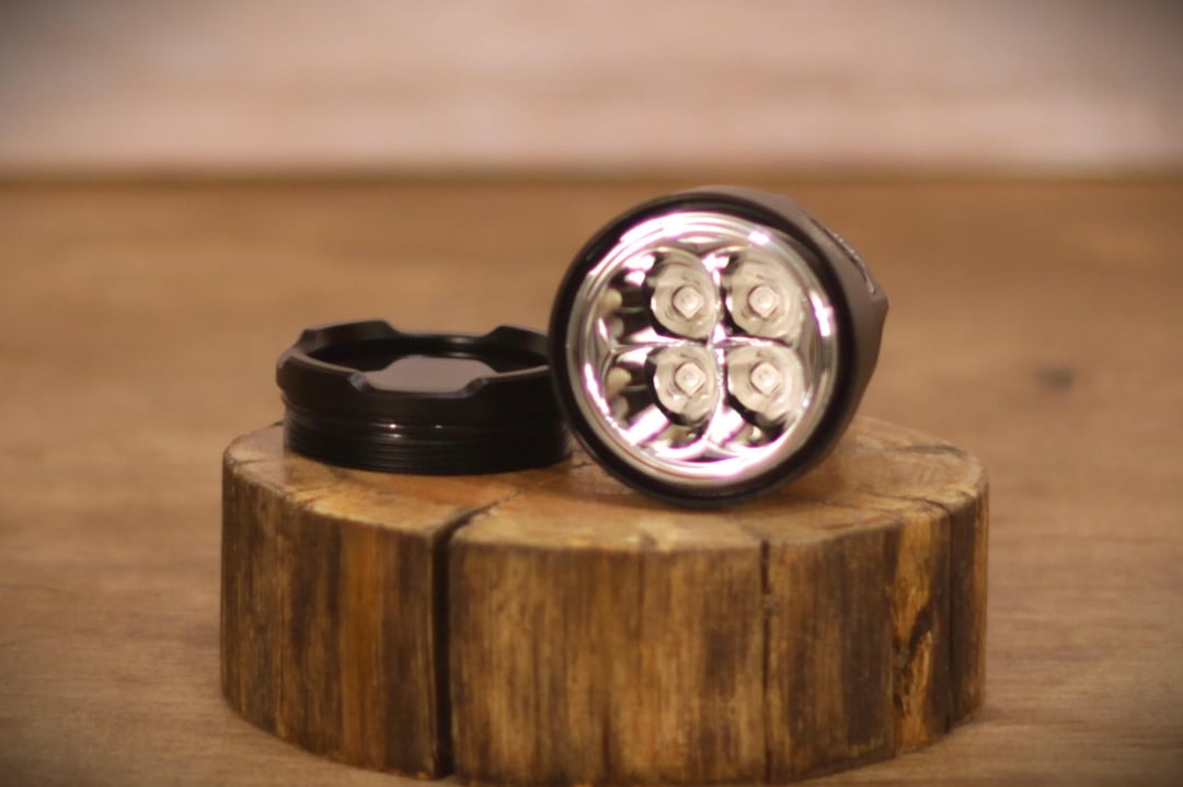 The reflector and ZWB2 filter are accessible by unscrewing the bezel of the flashlight. When doing this you may notice the reflector is made of plastic, probably to cut down costs due to the reflector complex design for 4 emitters. [9th picture]