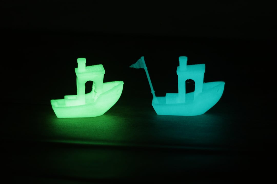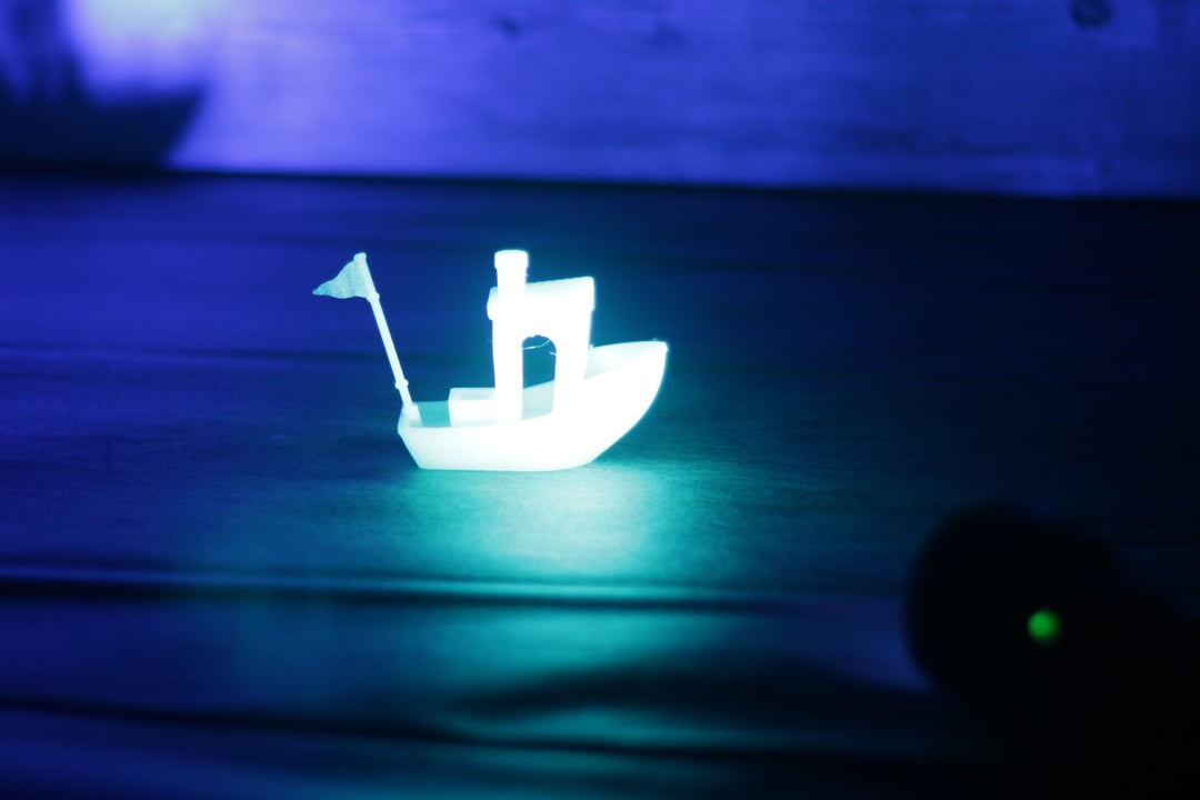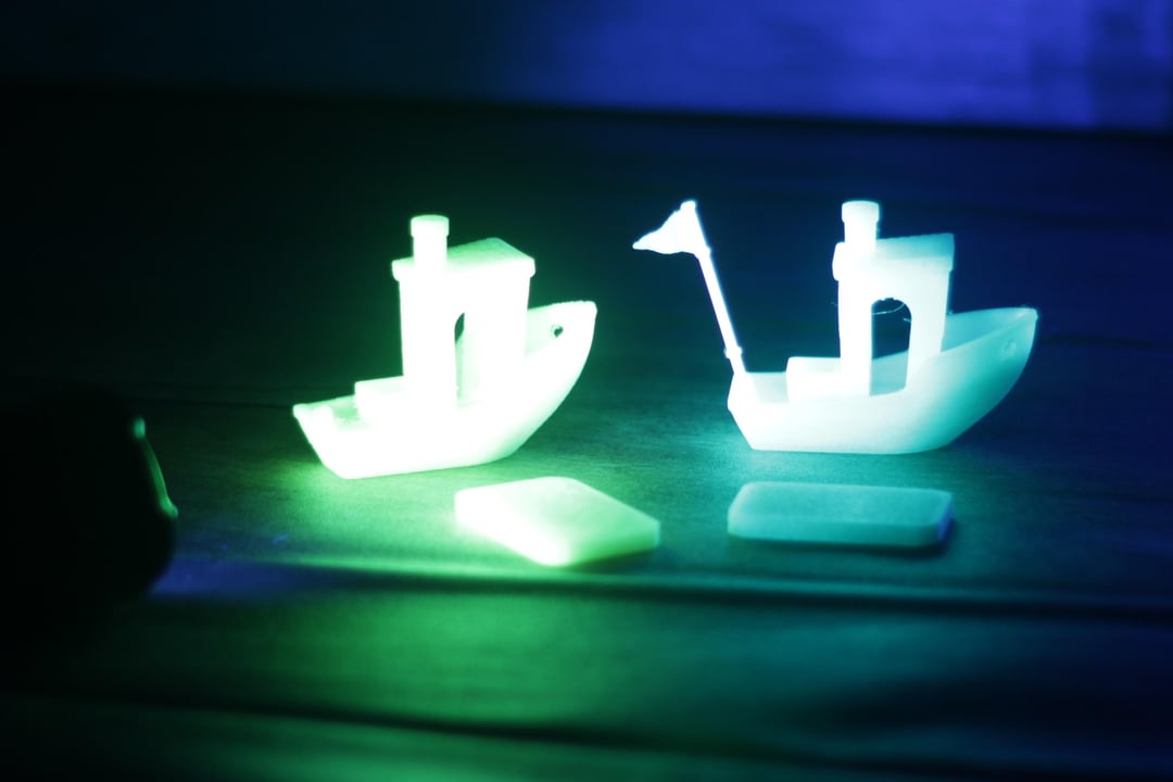 I tried looking for some scorpions near the forest, but (gladly, I think?) I didn´t found any. So I tested it on some green and blue Glow-In-The-Dark Benchy 3D prints I printed for this test.