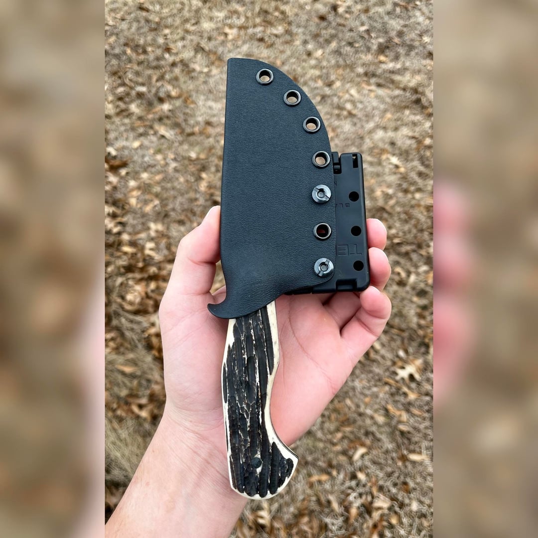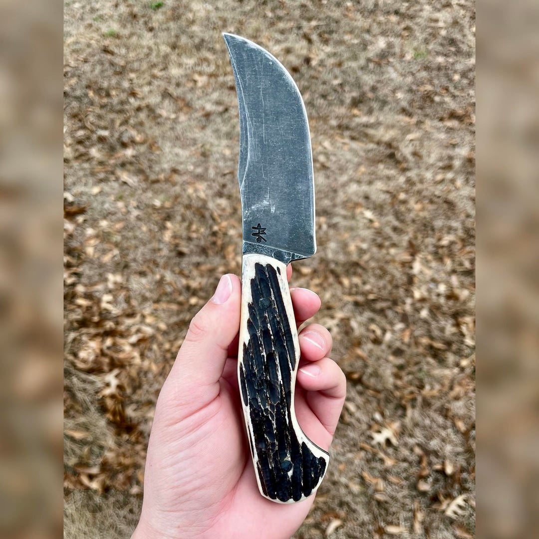 Forgot to get pics of this one before getting used and abused, but here’s my latest one. The blade is Pops ProCut and the handle is jigged bone. Had no problem cleaning two deer and making quick work of a piggy. This one is the first that I’ve kept for myself after making knives for a little while now.