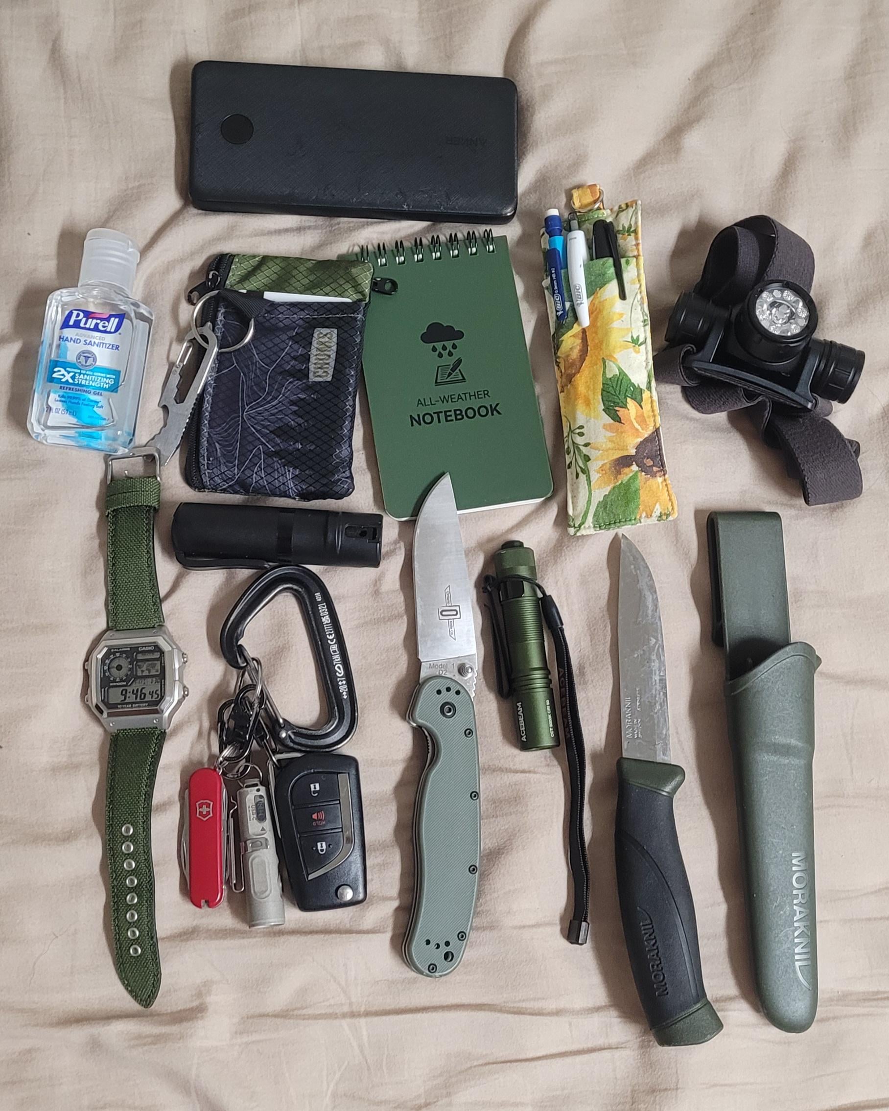 Anker cell charger, purell, Chums wallet with pry bar attachment, all weather notebook, pocket slip with sharpie/pen/pencil, Sofrin HS21 headlamp, Casio AE1200WH, clip with SAK Rambler/RivyVon Aurora A3 flashlight/key fob, Ontario Rat, Acebeam Pokelit, Morakiniv Companion