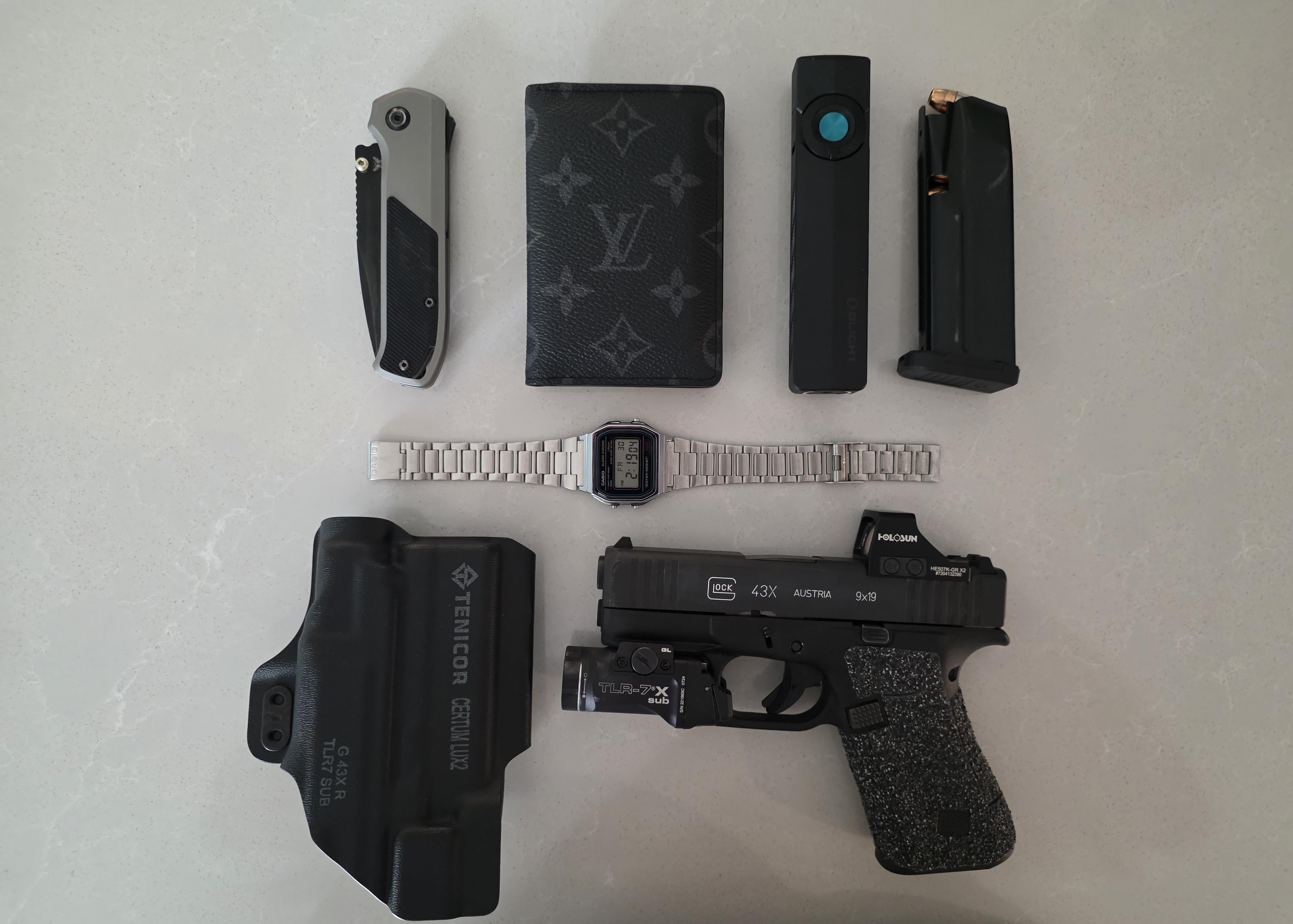 cuscus7 3 hours ago -Glock 43x with Certum Lux 2 Holster-Louis Vuitton Pocket Organizer-Flytanium Arcade-Olight ArkPro-Casio A158WA