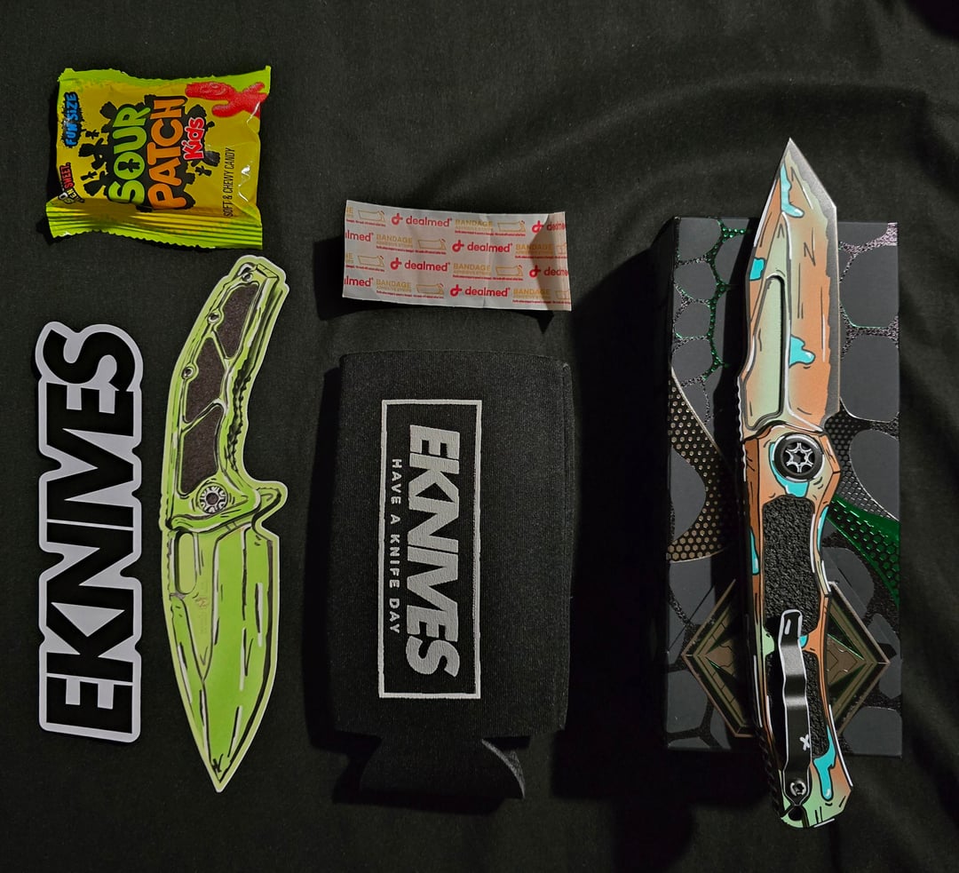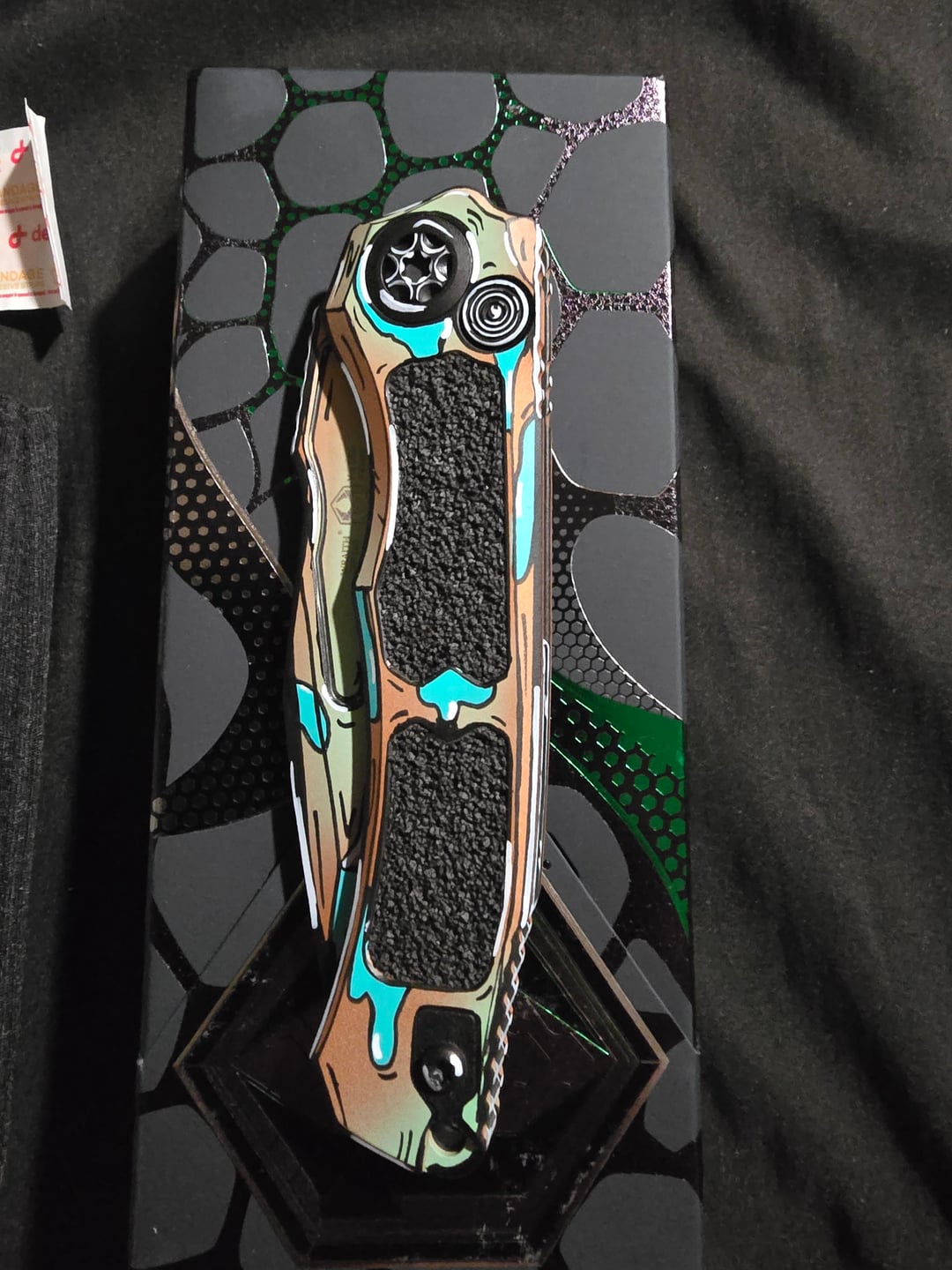 Heretic Wraith V.4 Auto Tanto. Shipwreck Cel-shading. This thing blew my mind away. I've been a huge fan of the Medusa and Wraith cel-shade knives for a while, but they were always sold out everywhere I looked. Heretic released this one last week. It sold out on DLT immediately, and SMKW wouldn't ship it to my address(idk why, I've ordered auto knives from there before), so I wound up on EKnives. Great packaging, a handwritten note, and a few little extra goodies(yes, a bandaid, lol) as you can see. Paying taxes sucks, but I wouldn't hesitate to buy from them again. They shipped immediately as well. The knife is snappy and the cel-shade is sweet. No regrets.