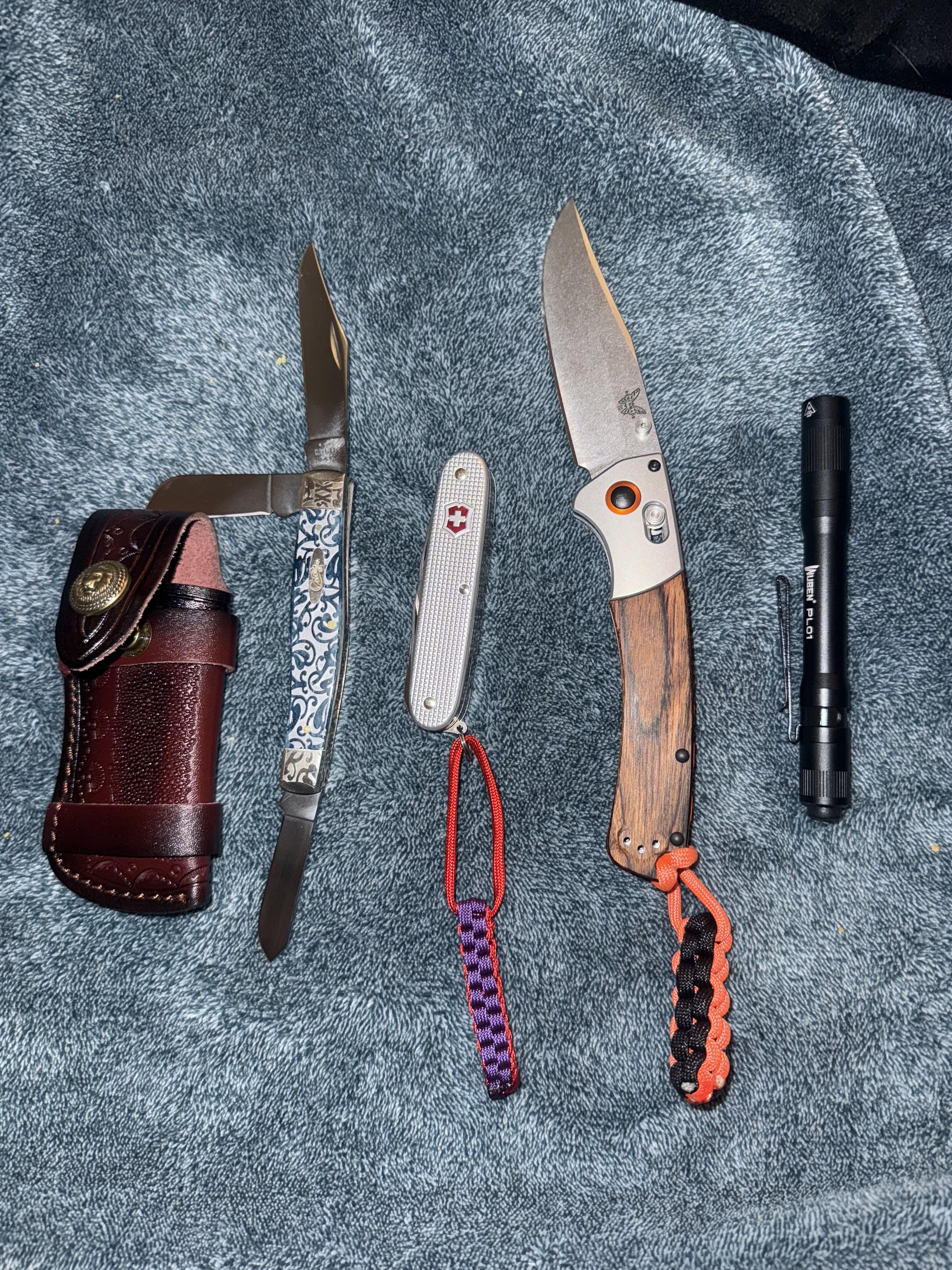Case large Stockman, Mediterranean blue Ivy silver engraved, Swiss Army Farmer, $350 Benchmade (forgot the name) and a $20 wuben light that kicks ass. Lanyards have grown on me recently