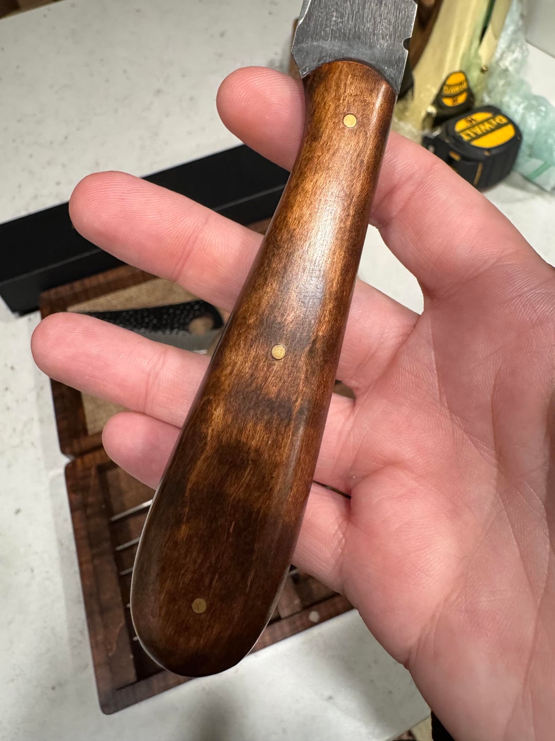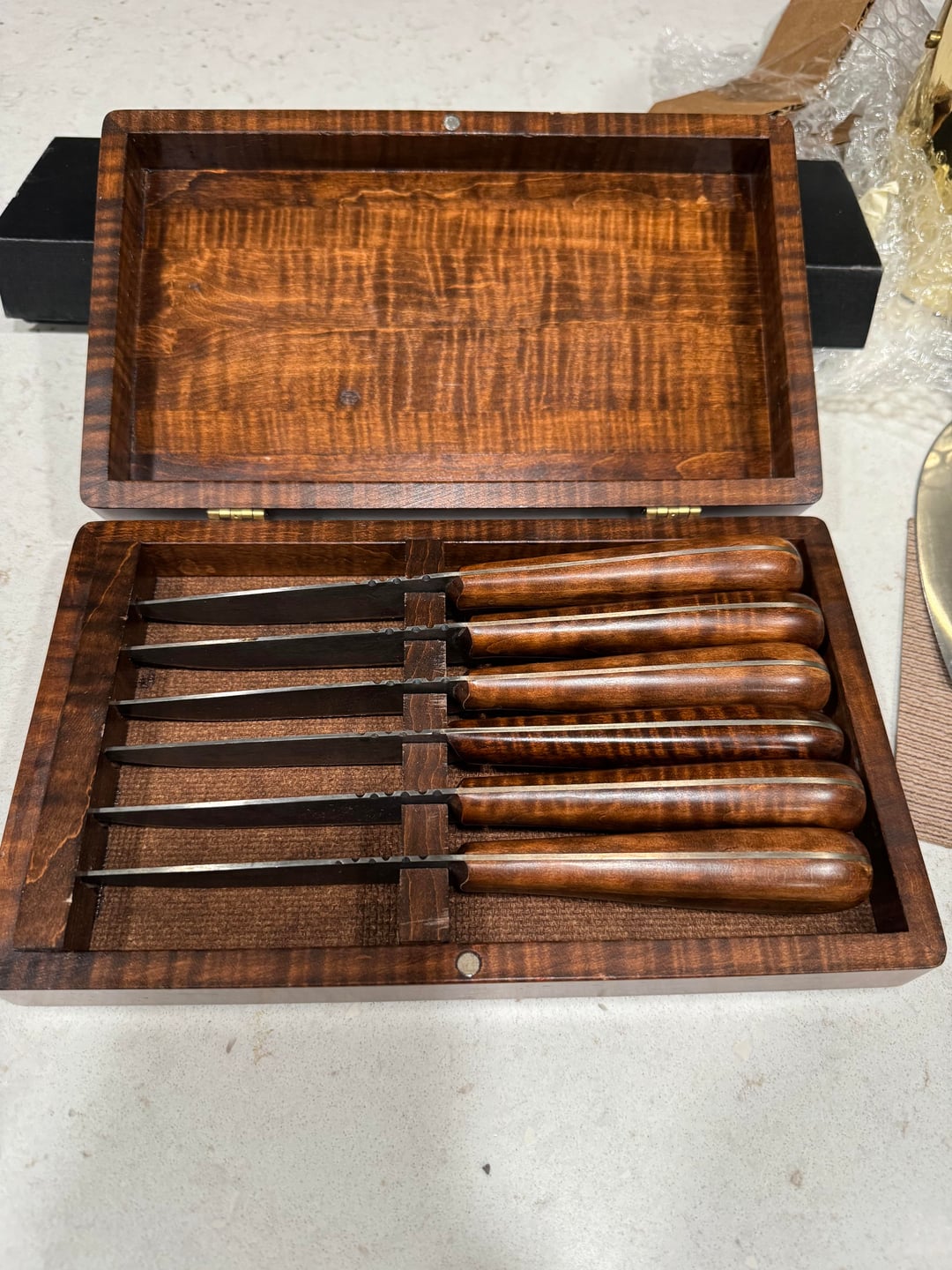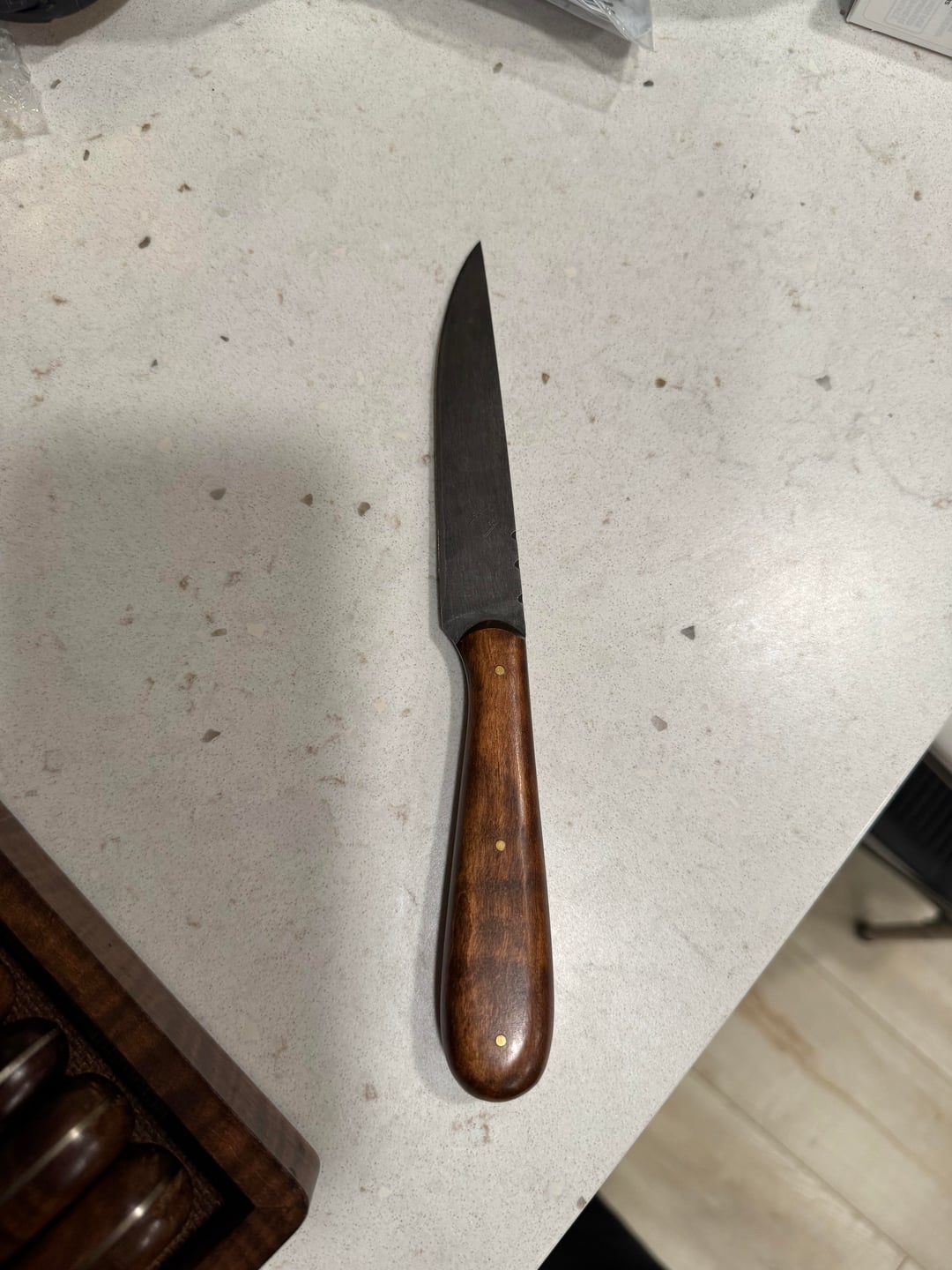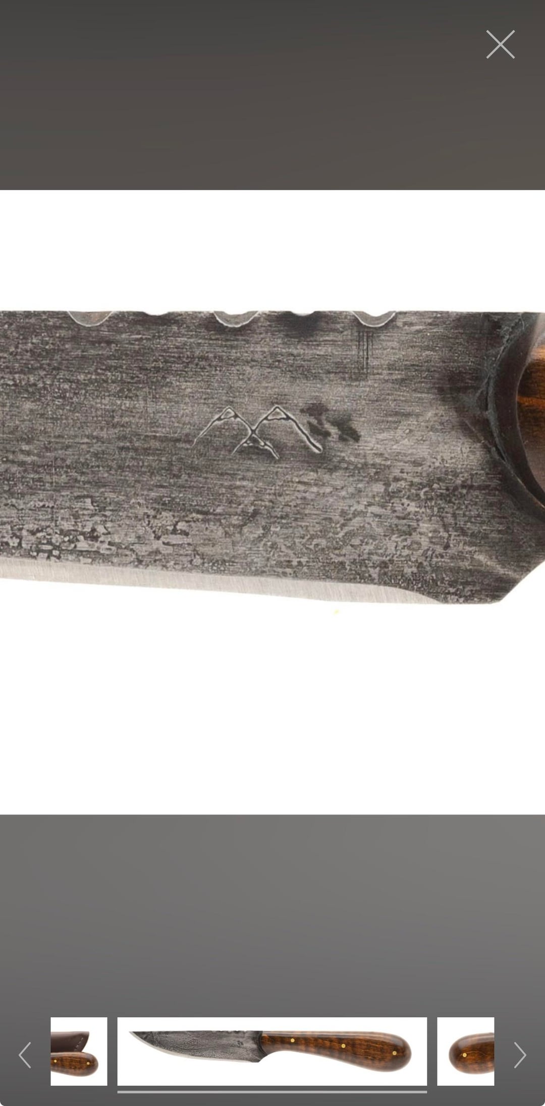 I bought a lot of knives online, I’ve been looking for steak knives. These looked nice, and didn’t have serrated edge. They are sharp and the handle is really nice feeling. There is a stamp that has 3 little mountaintops on it. I’ve googled and an image search found one image that matched and it just described it as a Black Powder Patch knife.