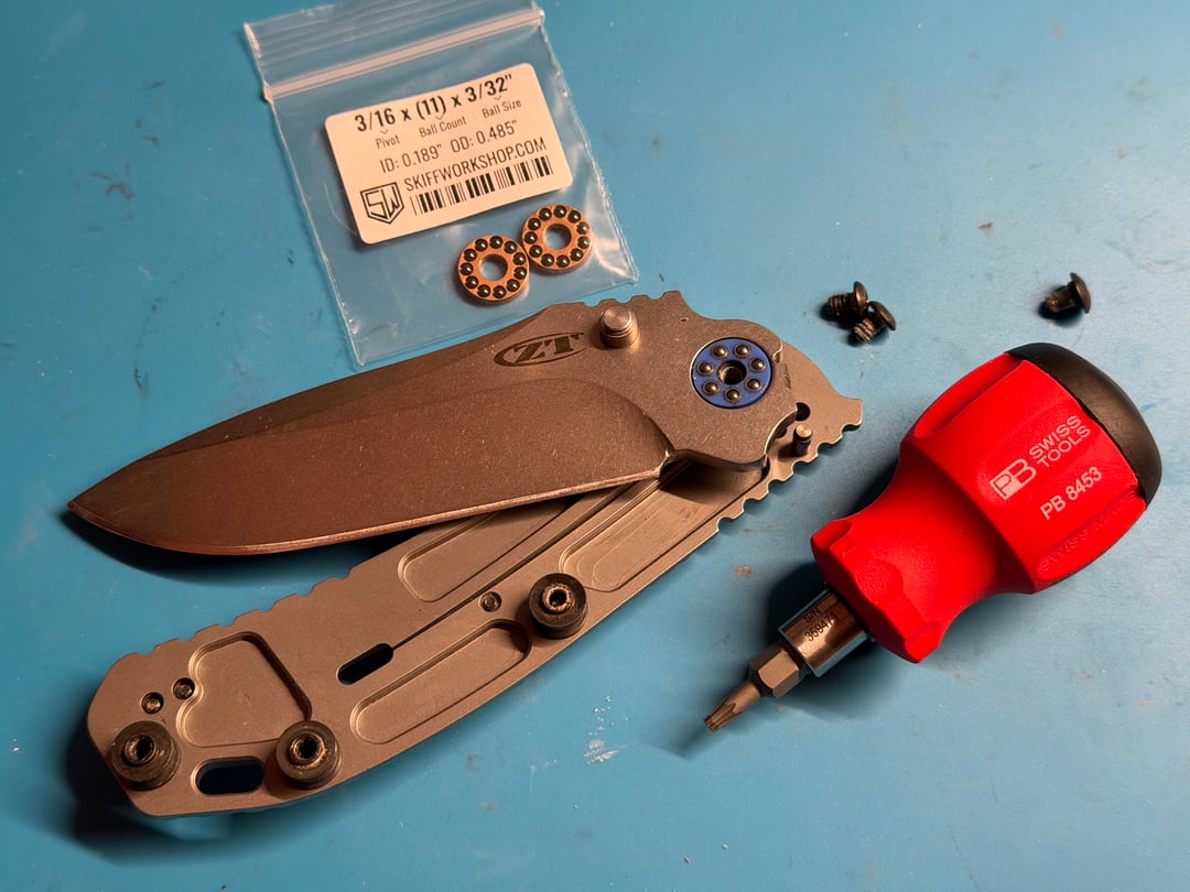 **Les George ESV**: Skiff thick washers make this thing perfection. Snappy washer action as if it came out of the factory int he style of the VECPs. Massive improvement to the crazy bearing action from the shop. Note, if you have a Hinderer Tri-Way kit lying around the stainless spacer + washer also fit, but the Skiff thick washers do it in a single piece which is marginally nicer…maybe placebo effect…
