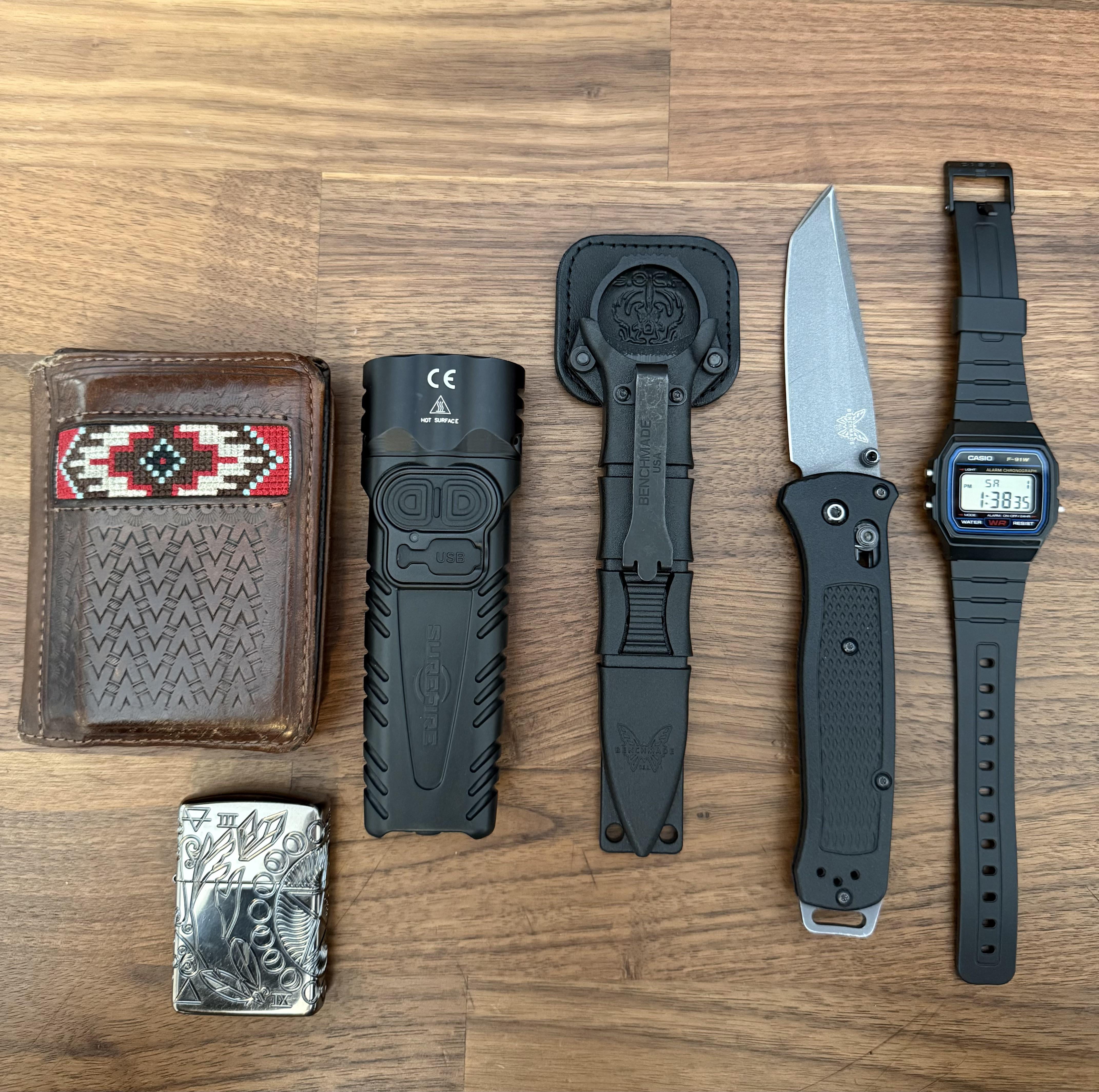 – Ariat tri fold wallet – Wicca armoured zippo – Surefire Stiletto 2 pro – Benchmade Socp mini dagger – Benchmade bailout 3V – Casio F-91W