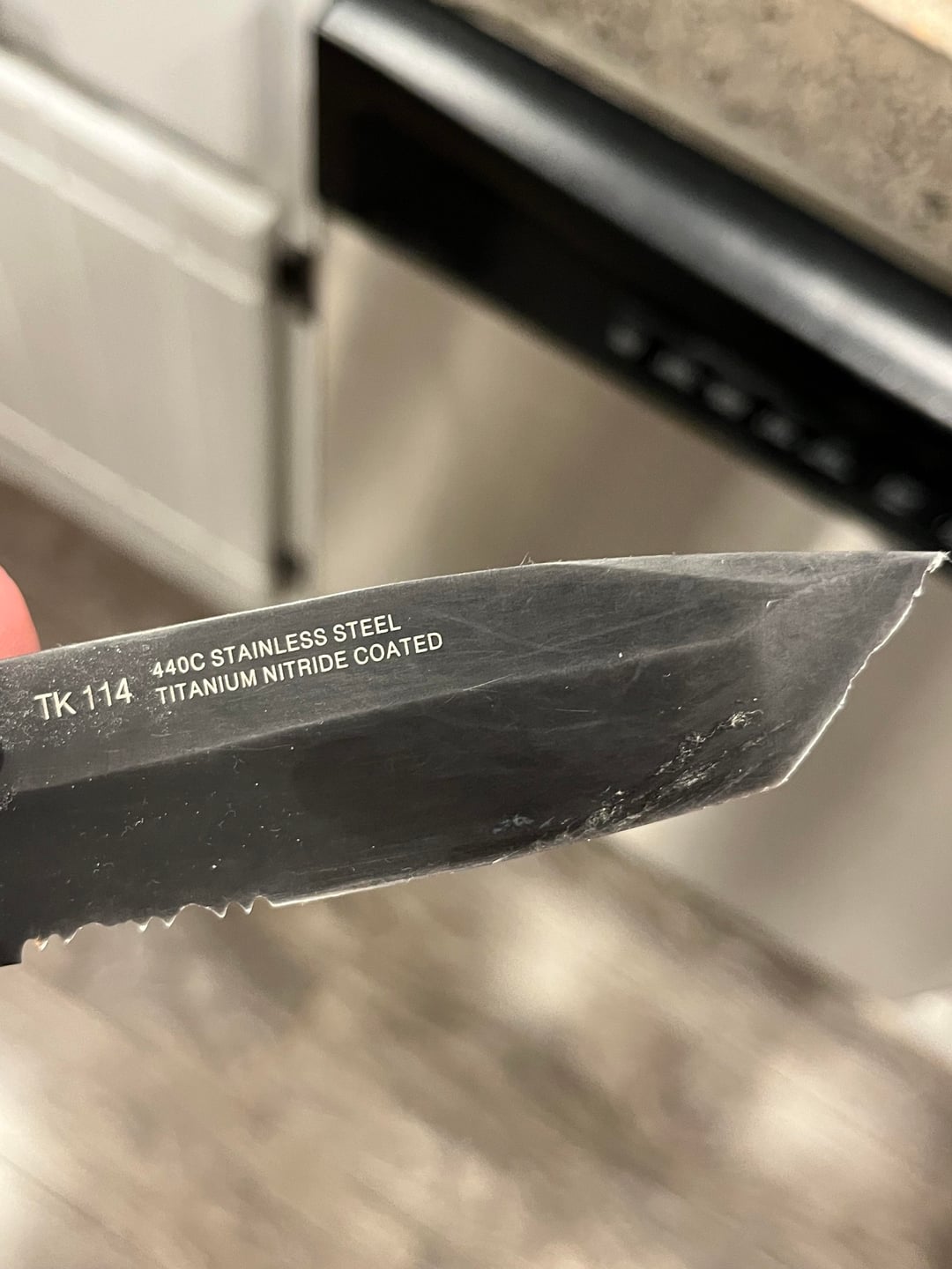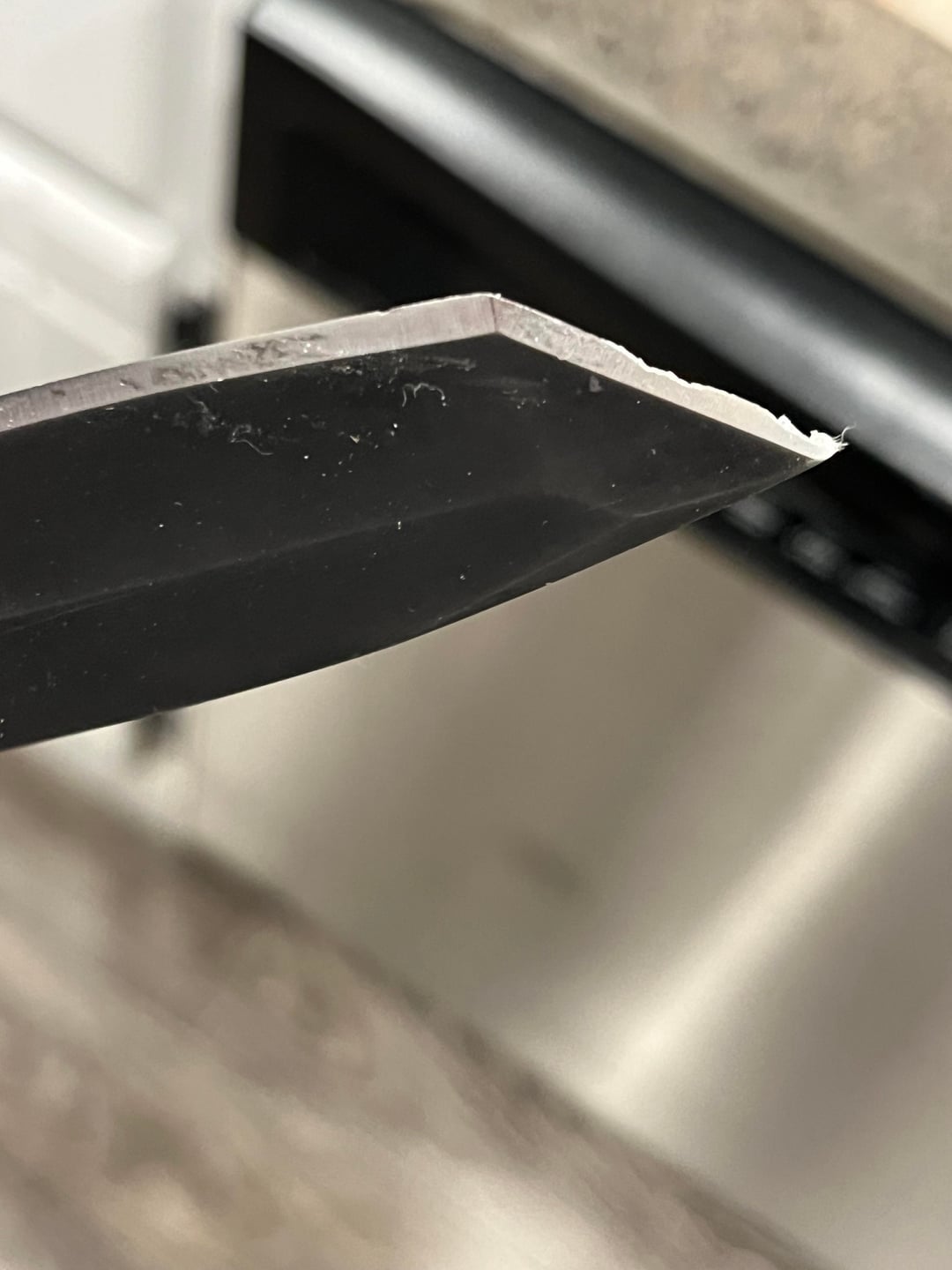 Oh yeah, that’s the best thing about a tanto blade in my opinion. I’d personally get a relatively fine, wide flat file, hit that edge till it’s straight again, then take a stone and a strop to it. She’ll be a straight razor in no time.
