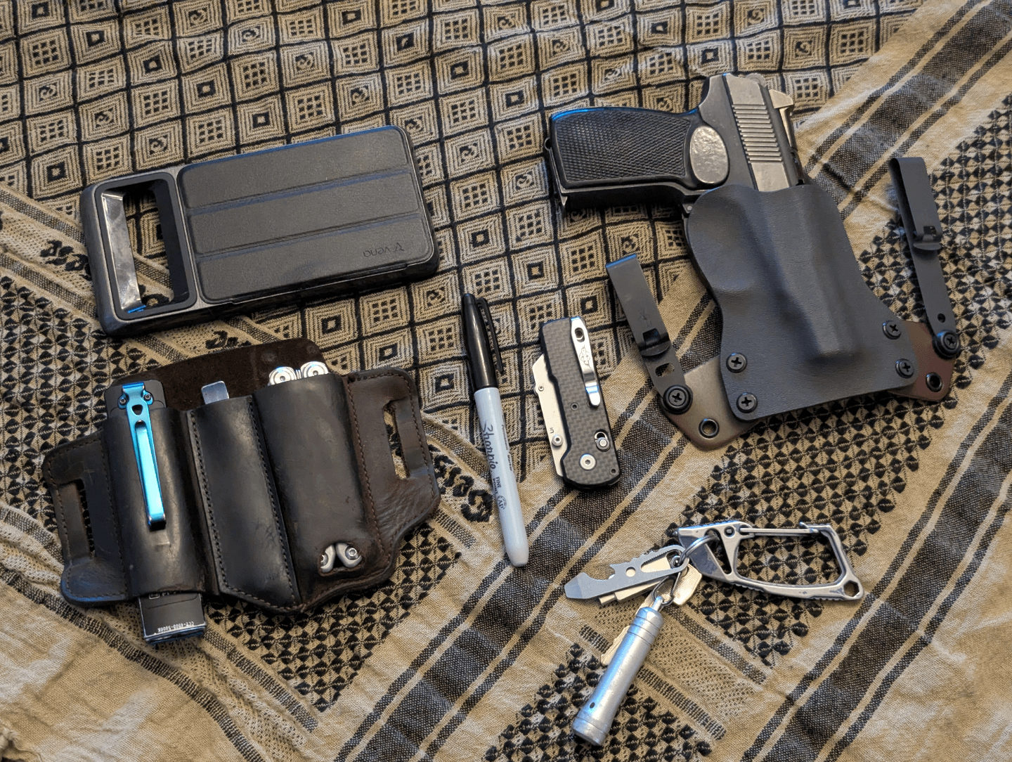 – Pixel 7 Pro in a wallet case – Amazon leather holster with Olight Arkfield, CountyComm UCS titanium, and Harbor Freight multi tool – Sharpie – Oknife utility knife (u1pro?) – Ebay keychain I cerakoted with truck key, flash drive, and mini grappling hook – Russian Makarov with custom rear sight, reblued, bakelite grips, and custom holster