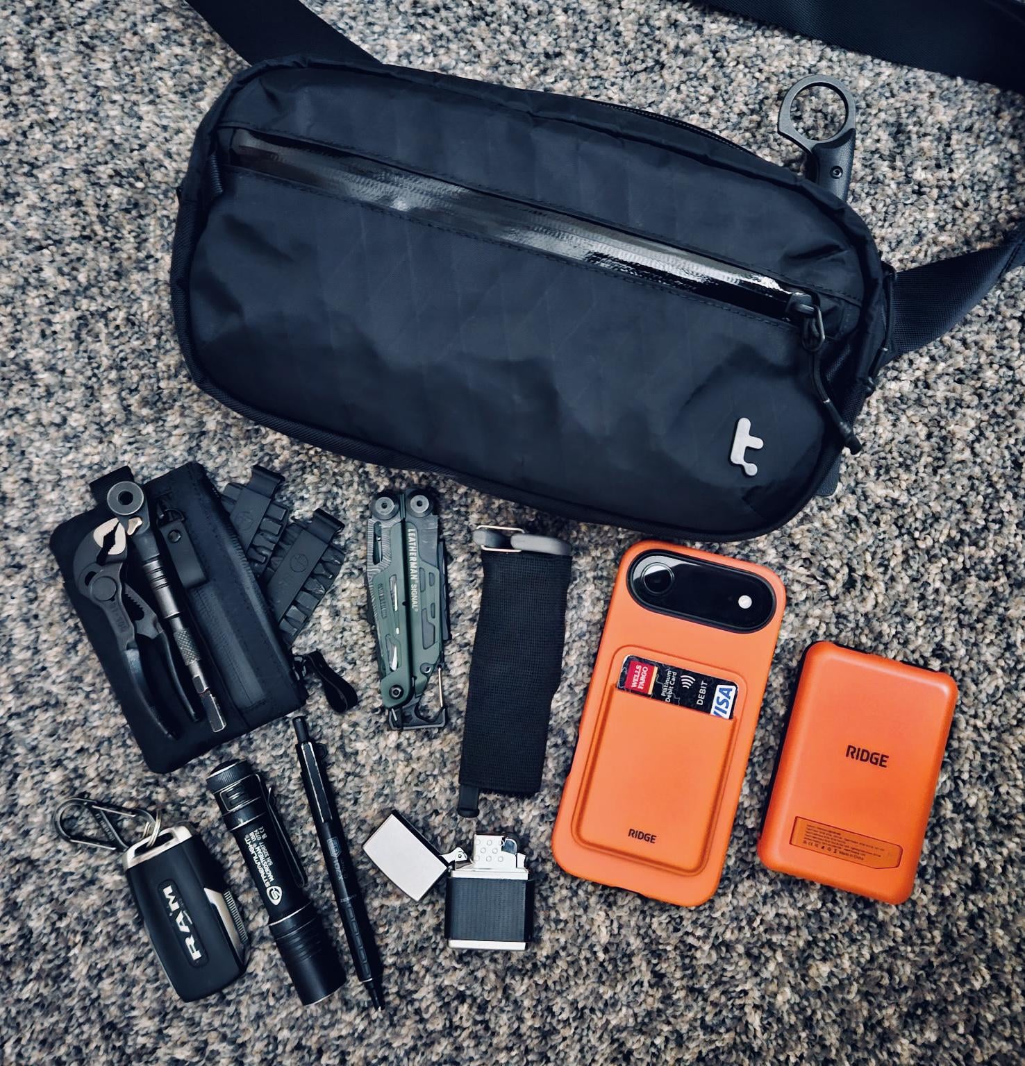 I used to have a “work carry“ and a “day-off carry” but they have slowly morphed into one. Tomtoc 3.5L X-Pac Sling. Alpaca Hub Pro X-Pac. Leatherman Signal + Bit Kit + Extender. Galvanox Ratchet. Knipex Cobra XS. iPhone Air with Ridge Case + Card Holder + Battery Pack. Snakestaff ETQ Gen 2. Zippo with Yellow Flame Insert and Gorilla Tape. Streamlight Macrostream. Zebra X-701. Key Fob with Nite-Ize S-Biner.