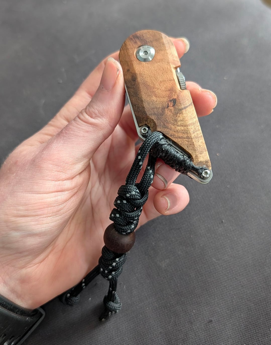 I'm not sure why I didn't start earlier. Here's my current line-up, I've made the wood scales from a piece of firewood on the big Boker and the little Kansept. I'm going to redo the Kansept one with what I learned from the other one eventually. The lanyards were fun to make too. They've all been sharpened and oiled and flick or glide nice, although the Texas Toothpick is really hard on my relatively small fingers. Oil and loosening the pivot helped.