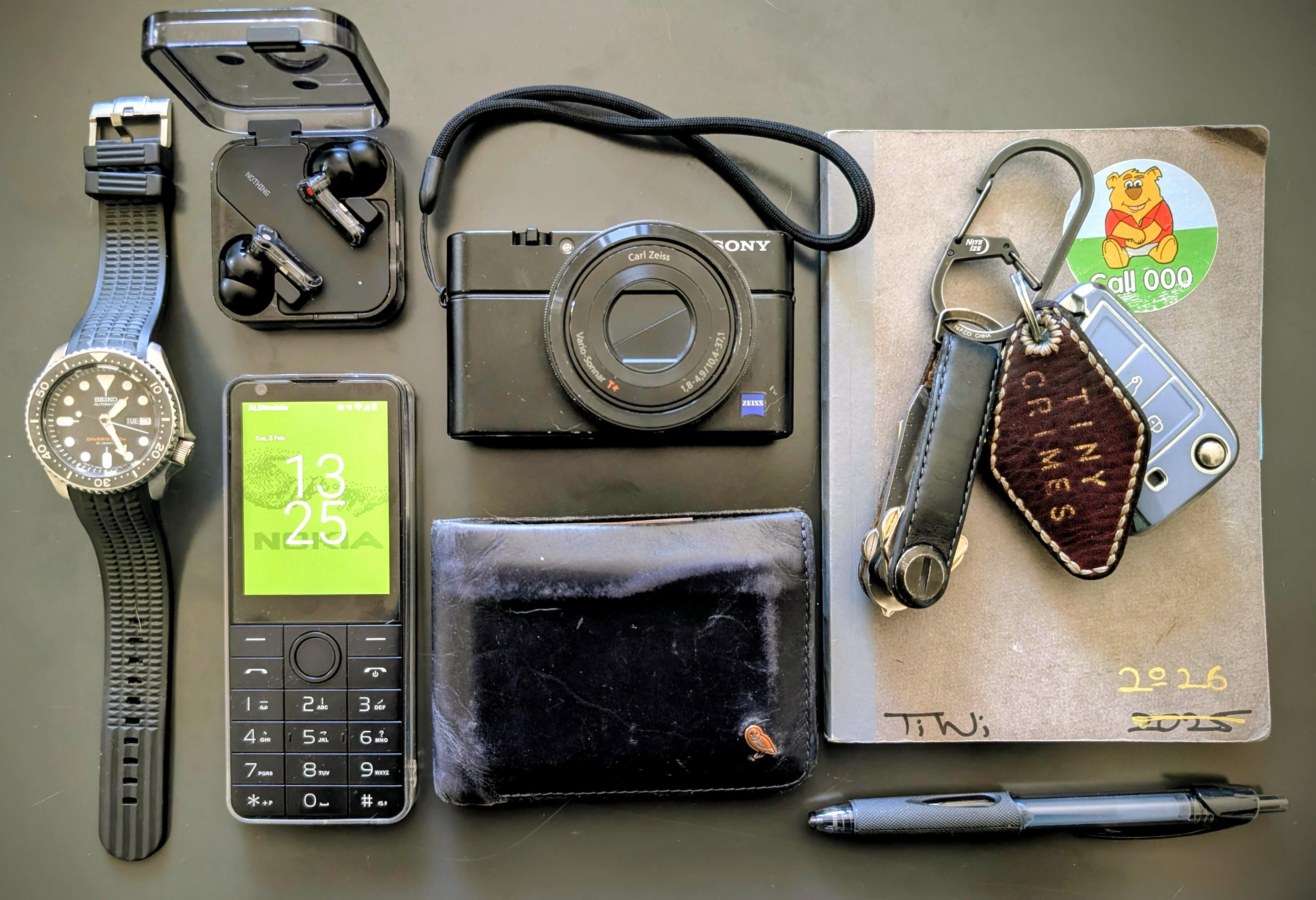 (n)EDC. Not truly an EDC. Left to right: Seiko SXKXO07 (modded), Nothing Ear, Doov R77 Dumbdriod (1 day old), Sony RX1001, Bellroy wallet, Muji note pad, keys with orbit key holder and Nite lze carabiner. don’t always take the note pad, pen, and camera, but often do. For work add a stethoscope, iPad with bluetooth, and a pair of raptors (which have been used for their intended purpose 3 times in ten years). No knives or guns required.