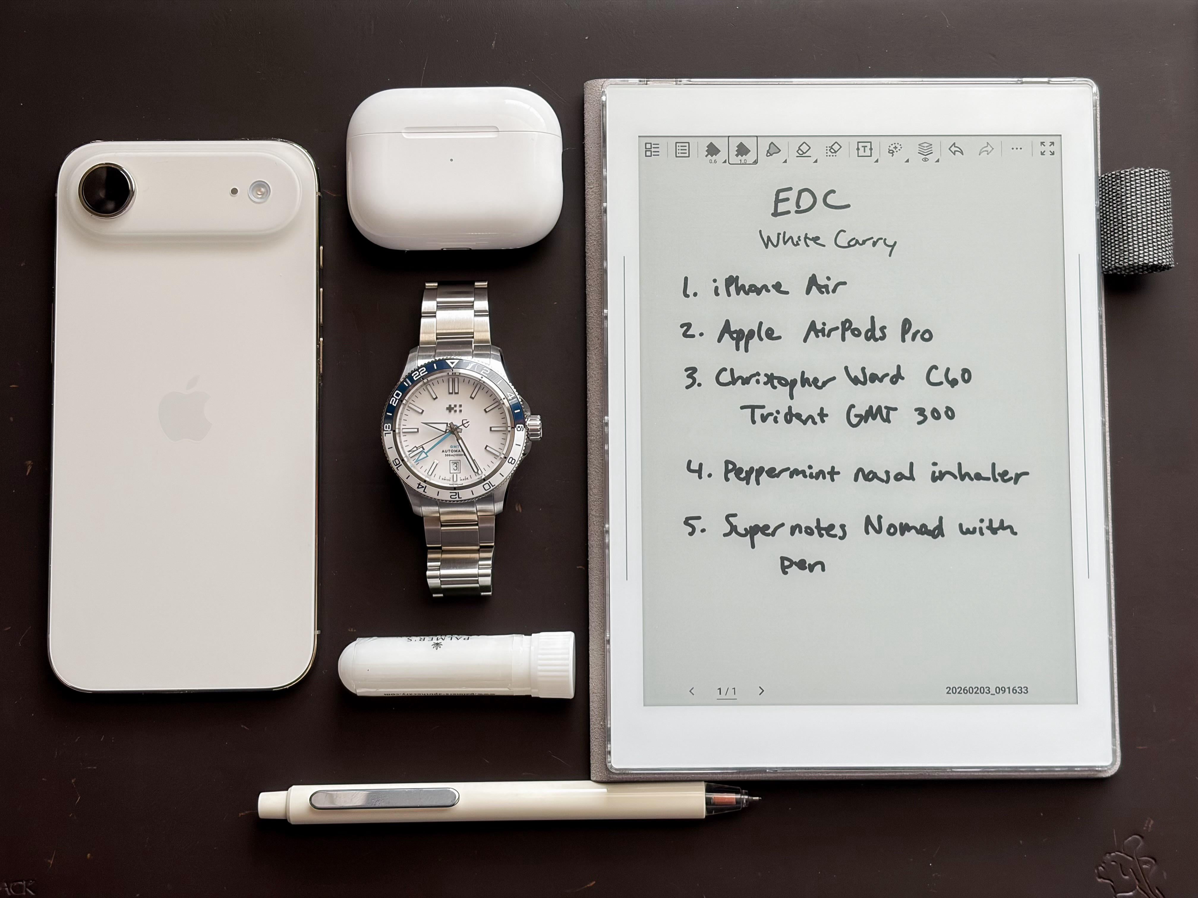 In EDC White Carry February 3, 2026 •iPhone Air•AirPods Pro•Christopher Ward C60 Trident GMT 300 40mm•Peppermint nasal inhaler•Supernotes Nomad with penby SpectreScout EDC Prev Post Nobly. Eagtac D3A February 3, 2026 Next Post New handle on benchmade 202 leuku February 3, 2026 Related Posts today’s things February 3, 2026 Help me upgrade my EDC and bring it into 2026 February 3, 2026 Polished edc😊 February 3, 2026 1 Comment AutoModerator 3 hours ago Thank you for posting to r/EDC! Include a detailed item list (make/model) within **1 hour** of submission. Lists can go in the title, a comment, or the image. Posts without lists will be removed. If you have already provided a list, not further action is needed, thanks | [FAQ](https://www.reddit.com/r/EDC/wiki/faq)*I am a bot, and this action was performed automatically. Please [contact the moderators of this subreddit](/message/compose/?to=/r/EDC) if you have any questions or concerns.*Write A CommentYou must be logged in to post a comment.