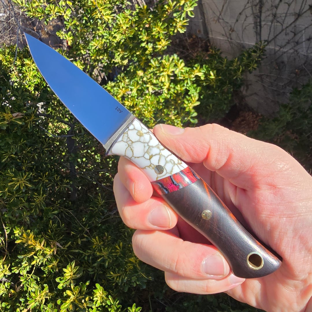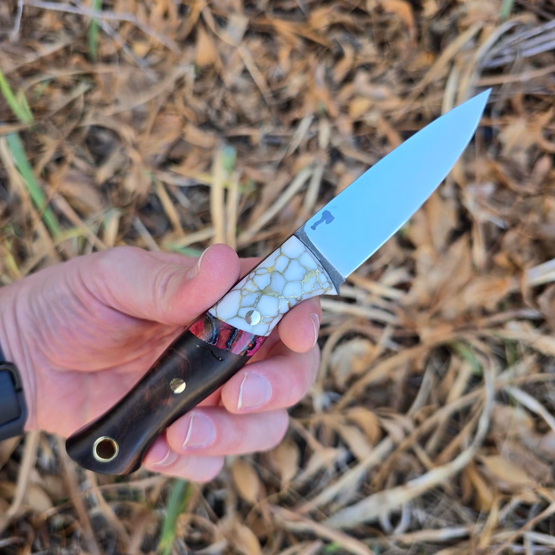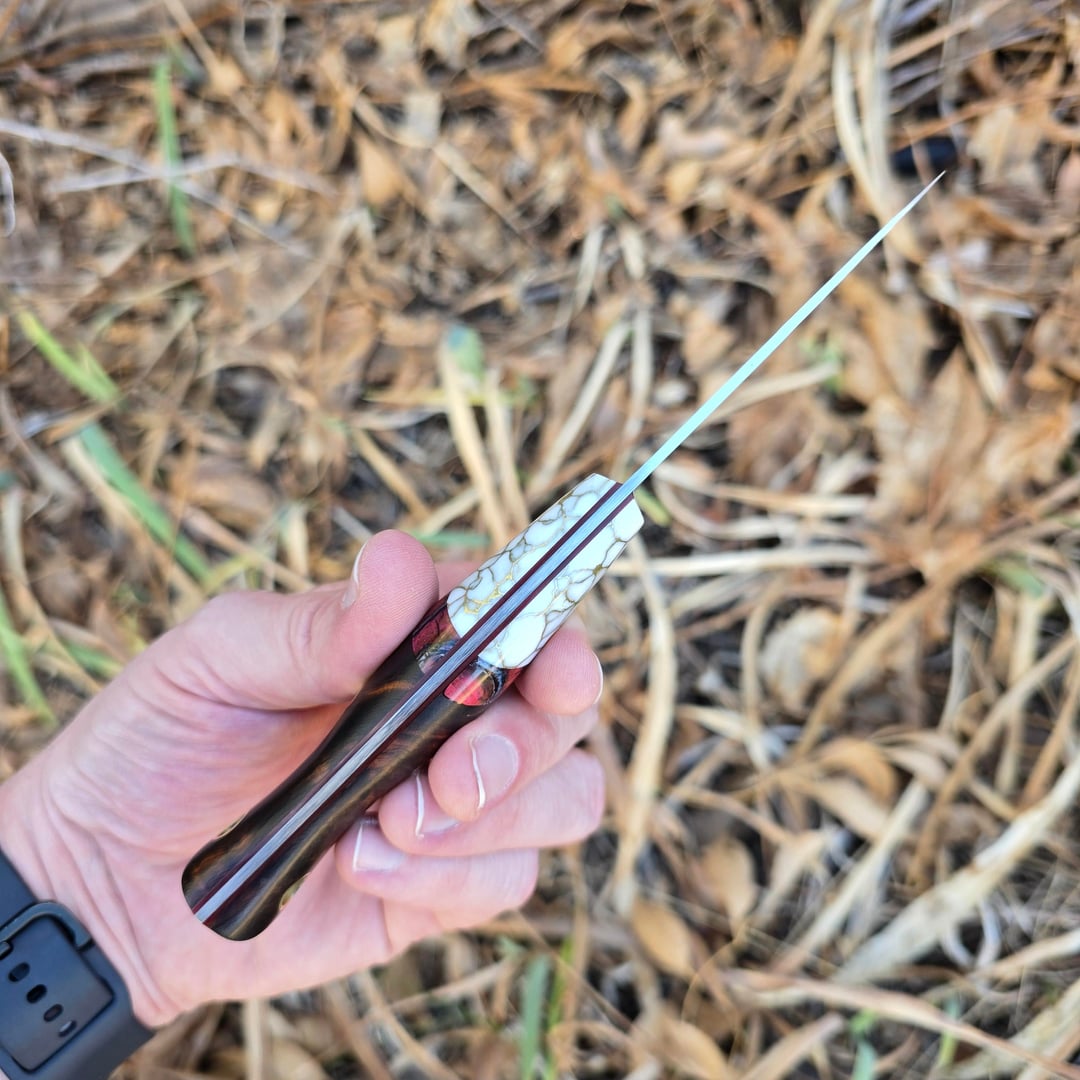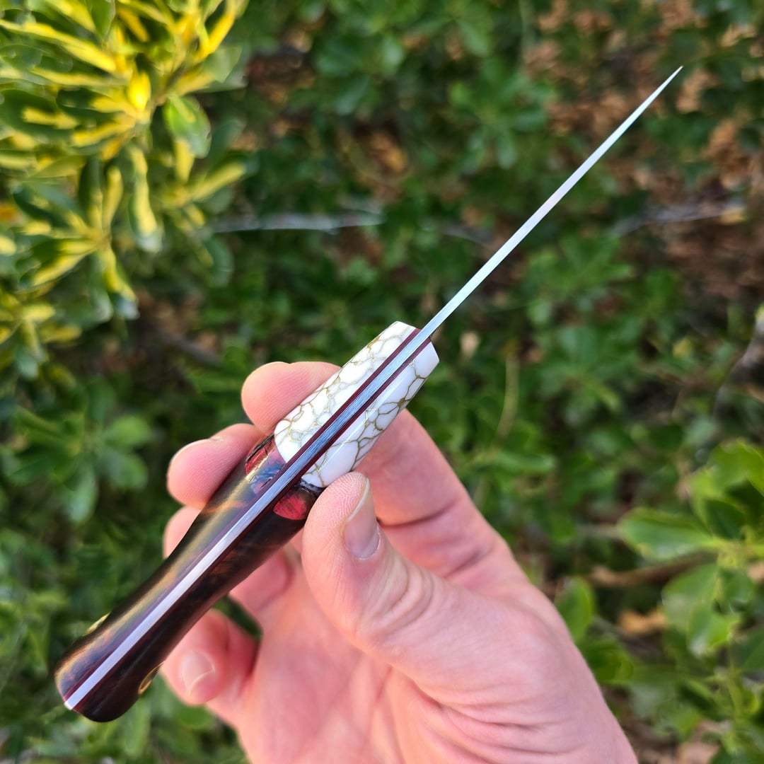 The handle has a white and gold trustone bolster, a red mammoth molar spacer, dark Arizona ironwood and brass hardware.