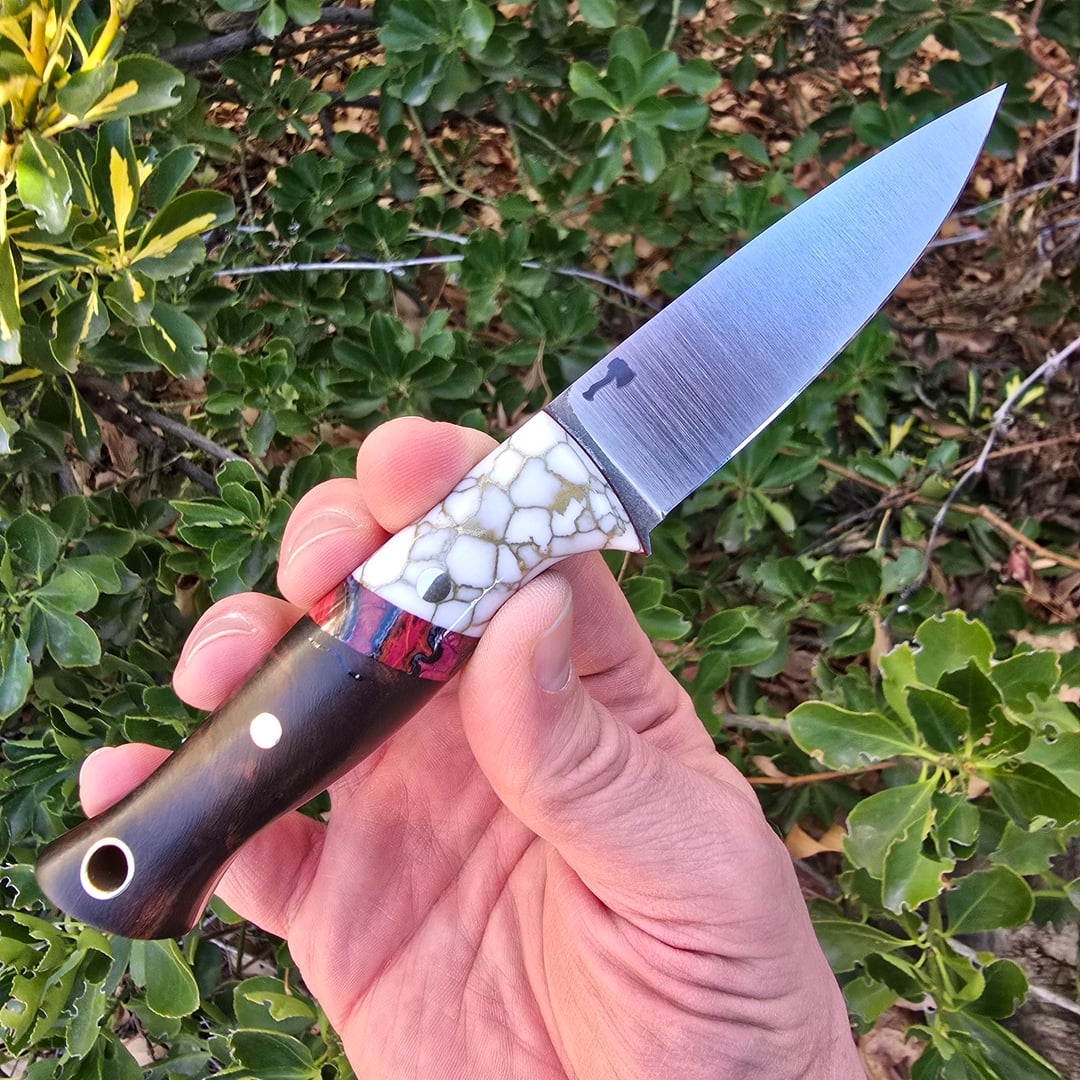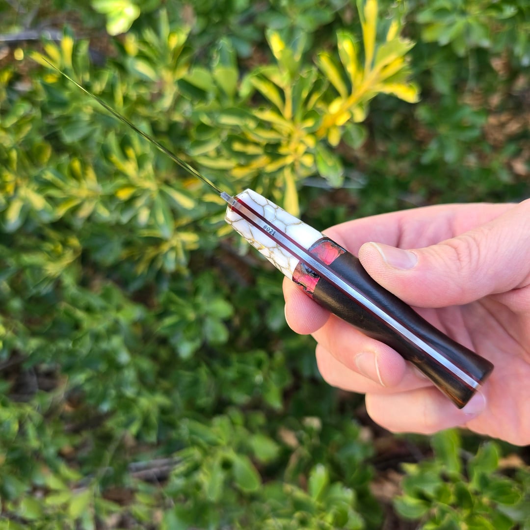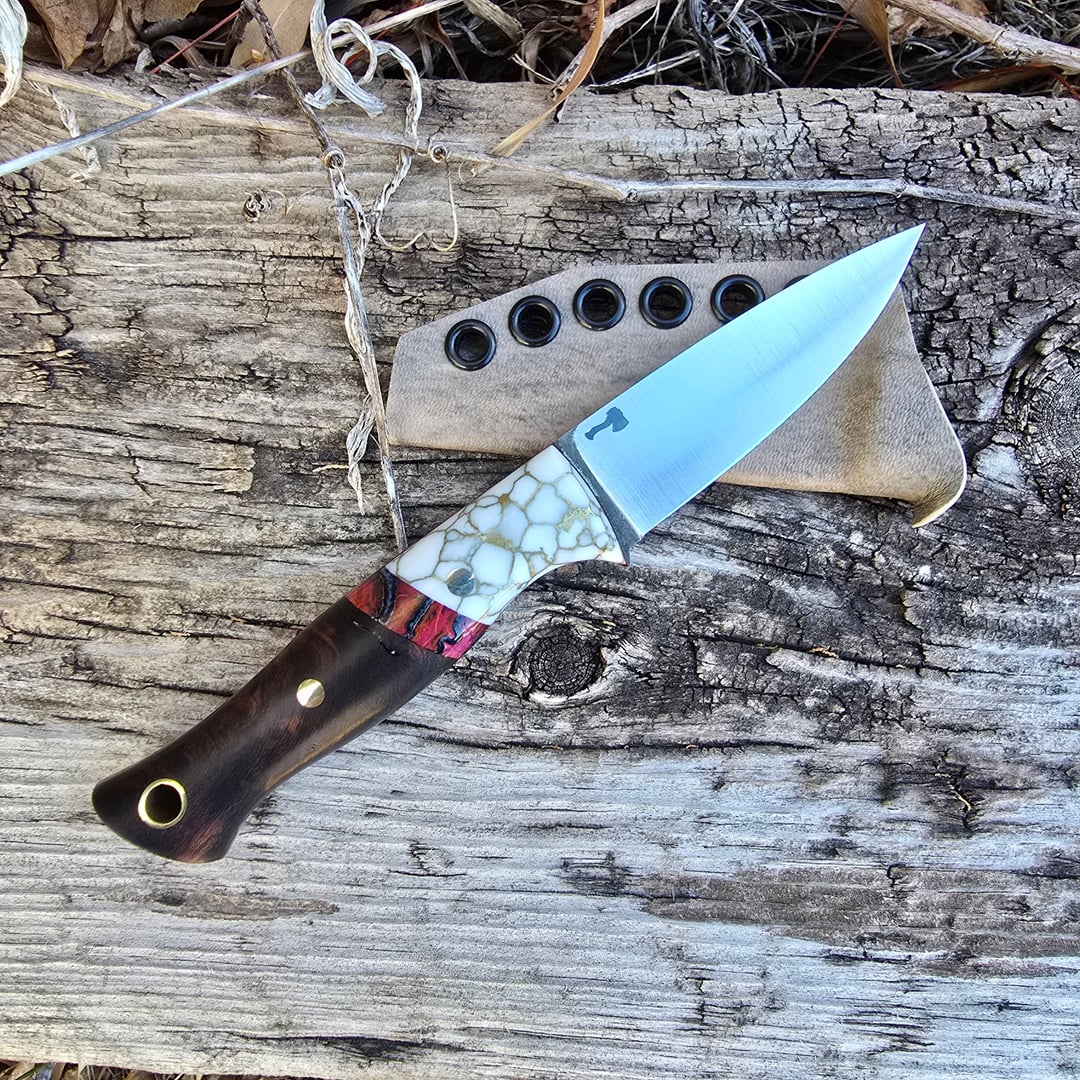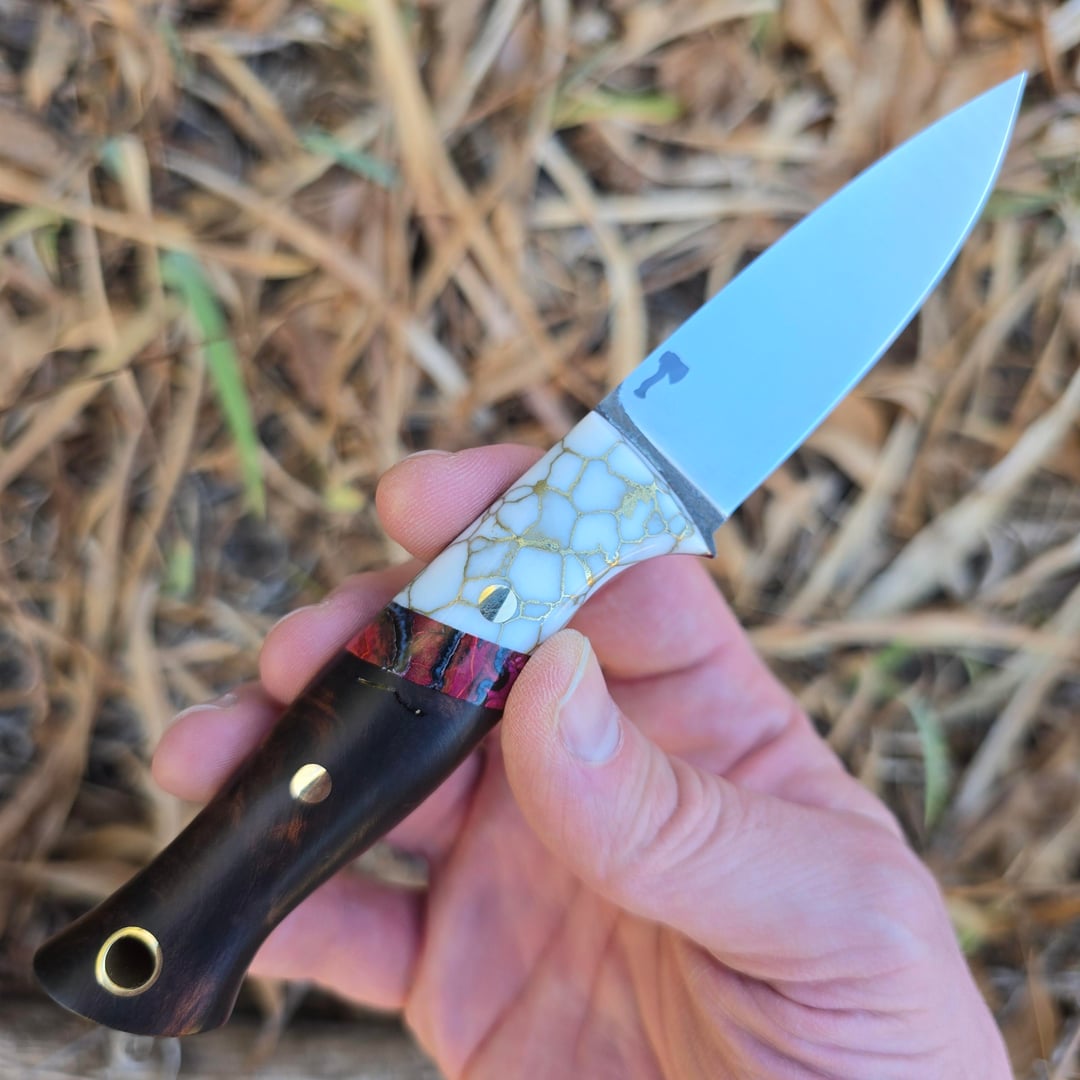 The handle has a white and gold trustone bolster, a red mammoth molar spacer, dark Arizona ironwood and brass hardware.