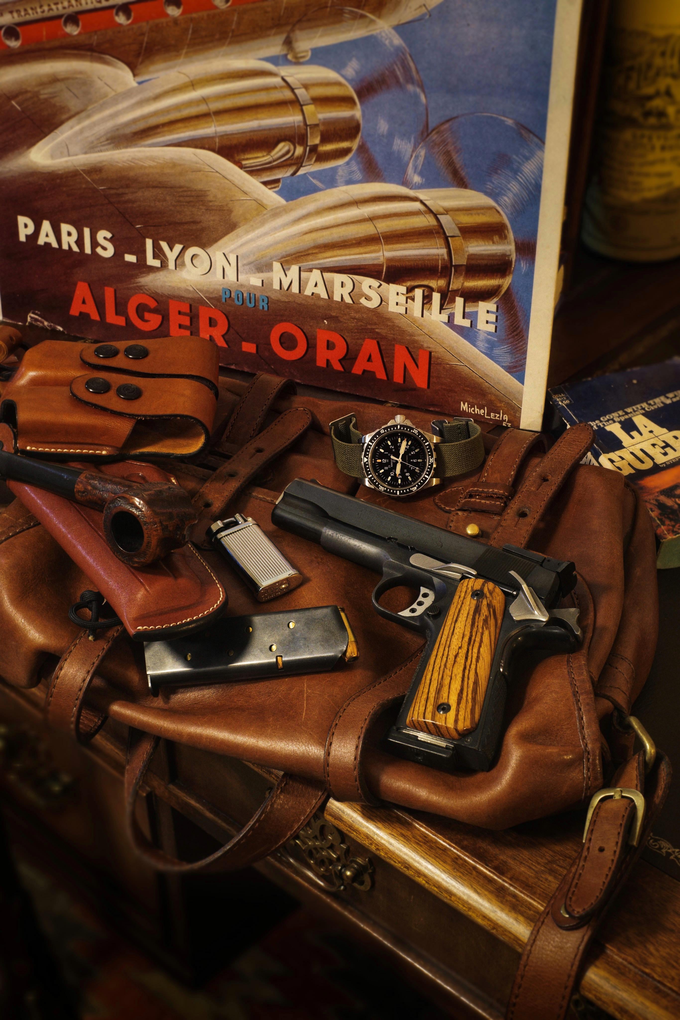 1. Cravar FC 15 bag 2. Colt 1911 Government 3. Algerian briar pipe 4. IM Corona lighter 5. Marathon JSAR watch 7. Spare 8rnd mag 8. Armadillo Leather Co shoulder holster 9. Paperback for when I get bored