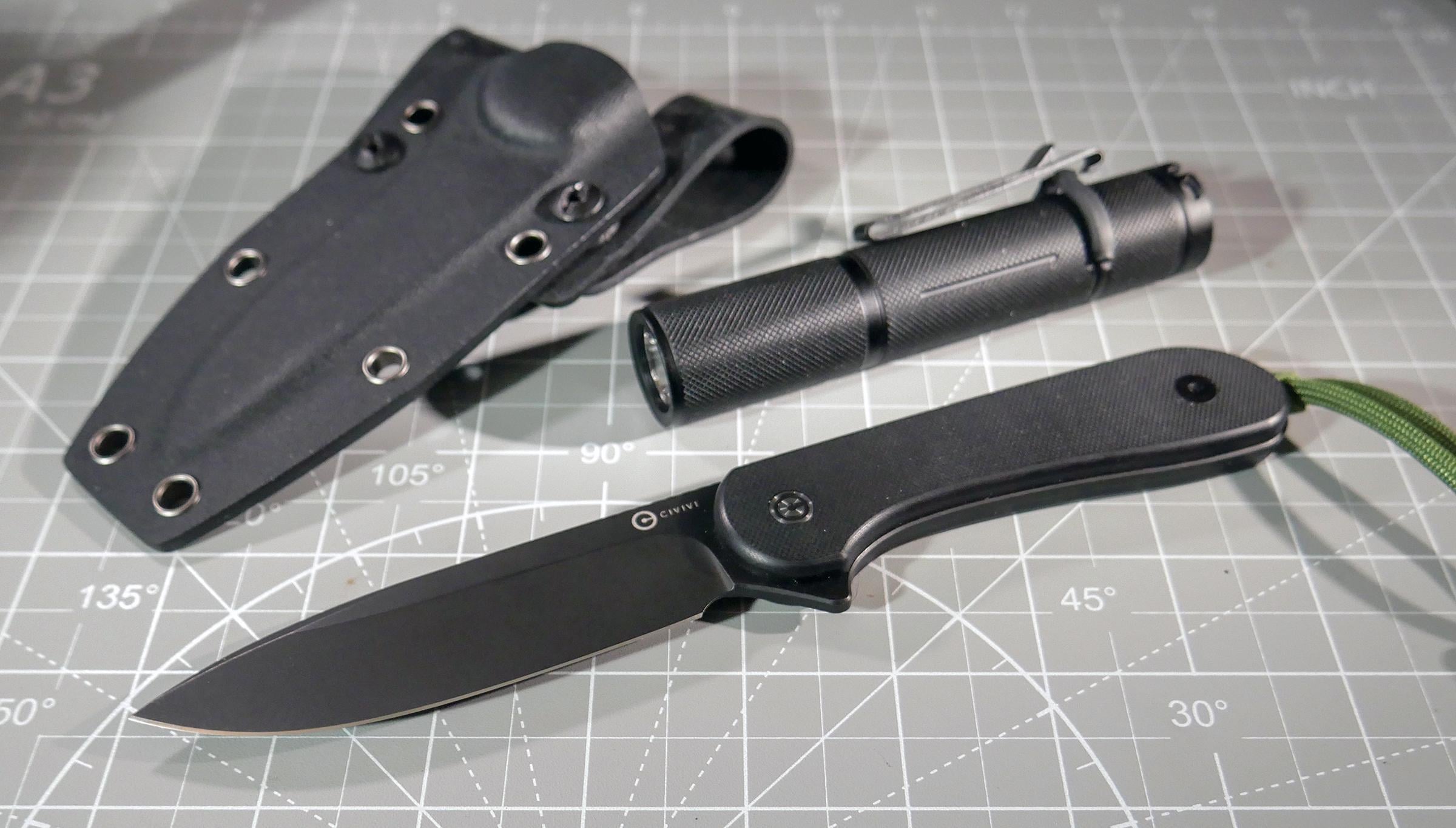 Fixed Blade Elementum (black/black) with Kydex sheath and a compact tac light.