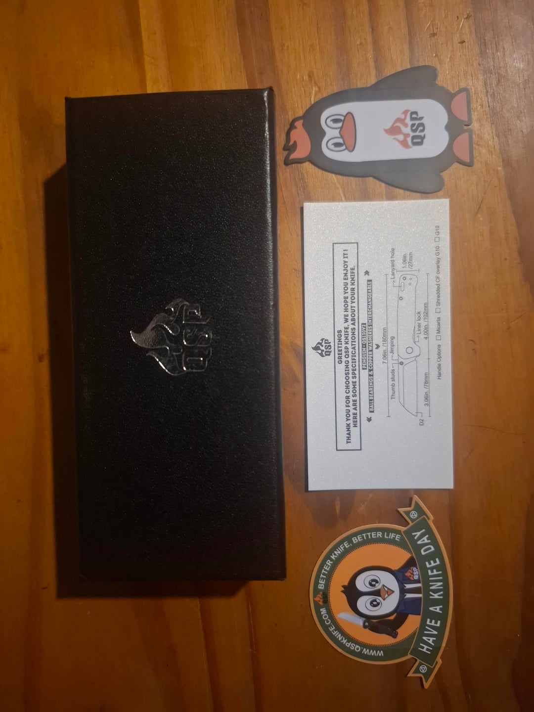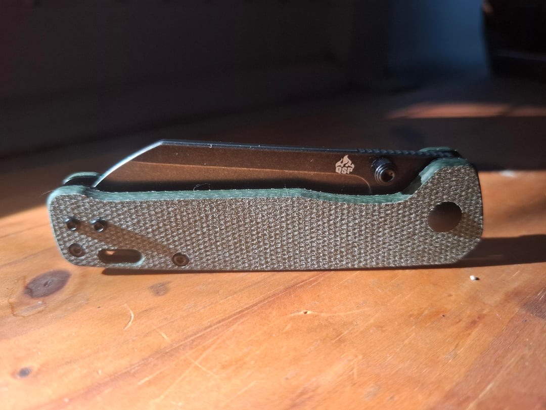 QSP Penguin V2 with the black stonewash blade and the green micarta handle.