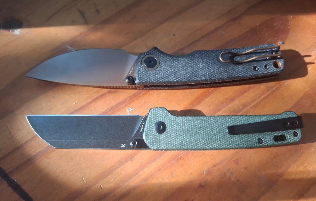 But they're very well built and feel good in the hand, although the micarta surprised me. I didn't expect it to almost have the texture of paper. And it seems to be a magnet for the cat hair that's all over my house lol. Also, the factory edge is really good. It feels smooth and the Vosteed already cut my finger while I was getting used to the closing mechanism.