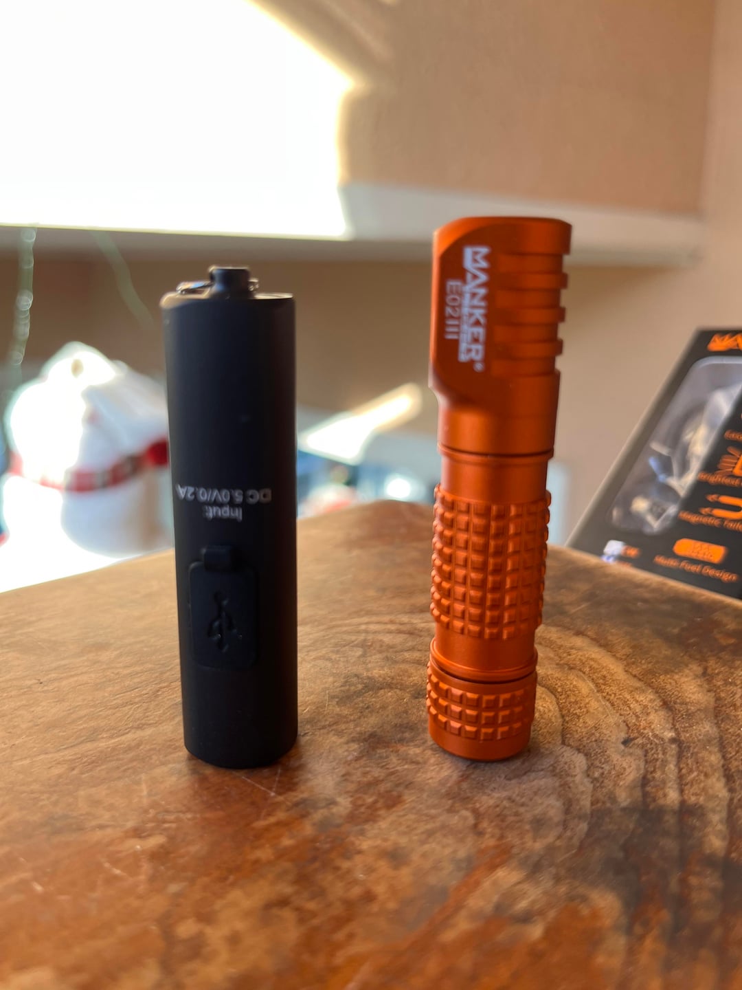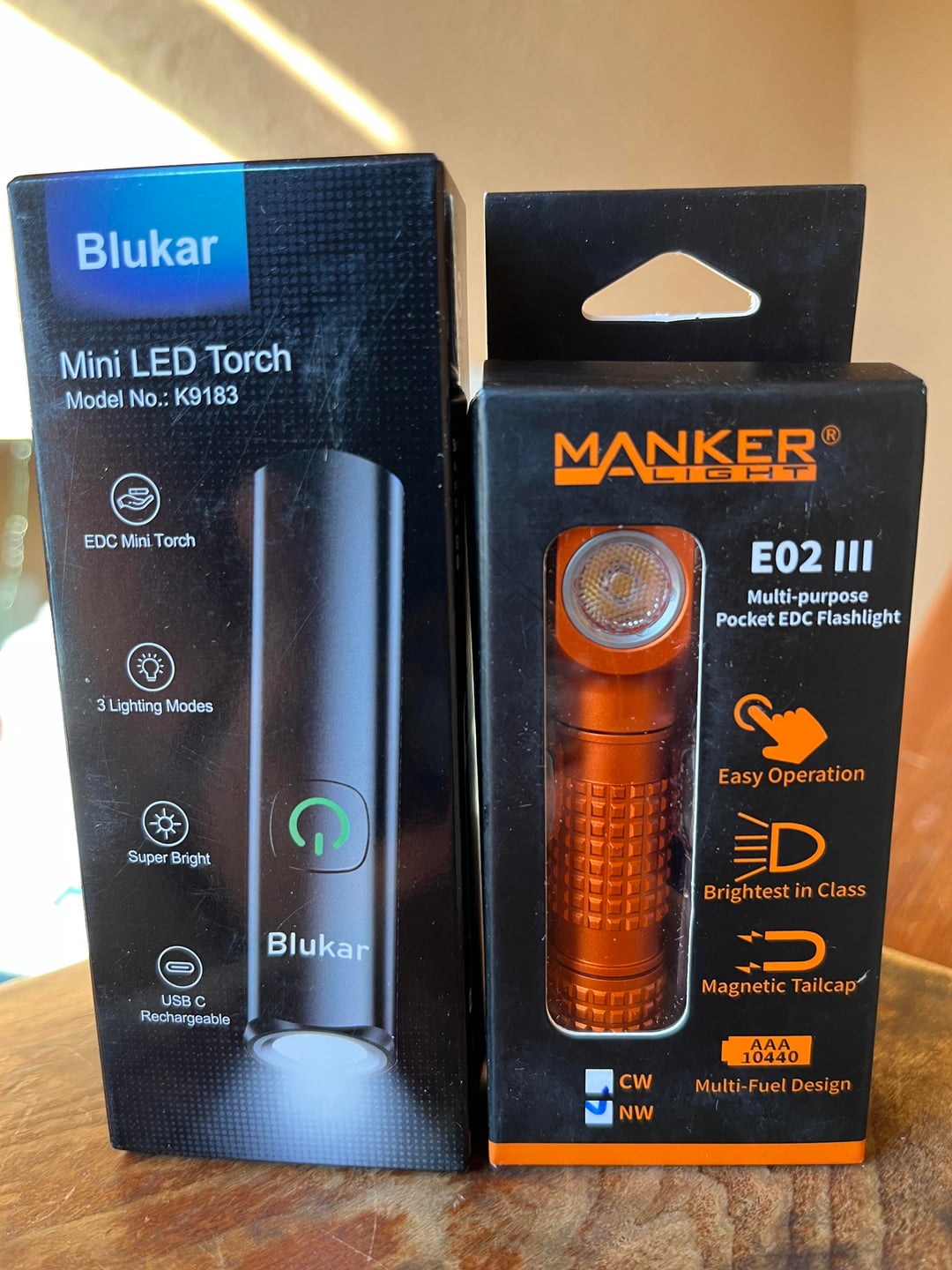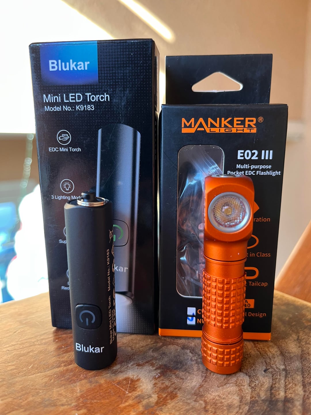 My second Manker and first dedicated angle light in the collection ( I’ve got a Nebo swivel lamp that can be set straight or at angle), and the Blukar which is one of my smallest USB C rechargeable lights. I really like the 4000K color temp. on the Manker also, a warm tint that’s very pleasant.