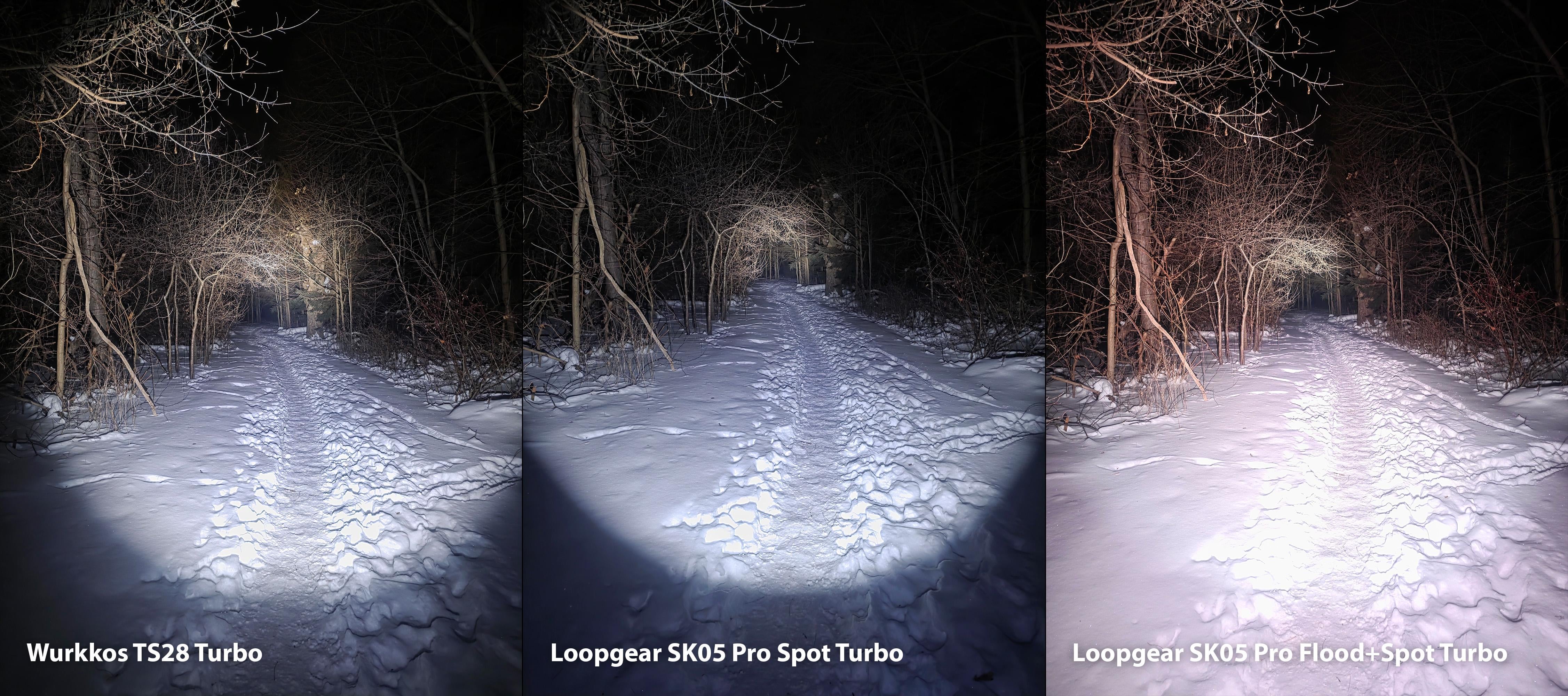 Wurkkos is actually putting out a bit more light than flood + spot on the SK05 together, but at this forest path, with the snow the different beam profiles, the SK05 feels twice as bright! The exposure is locked on these photos.