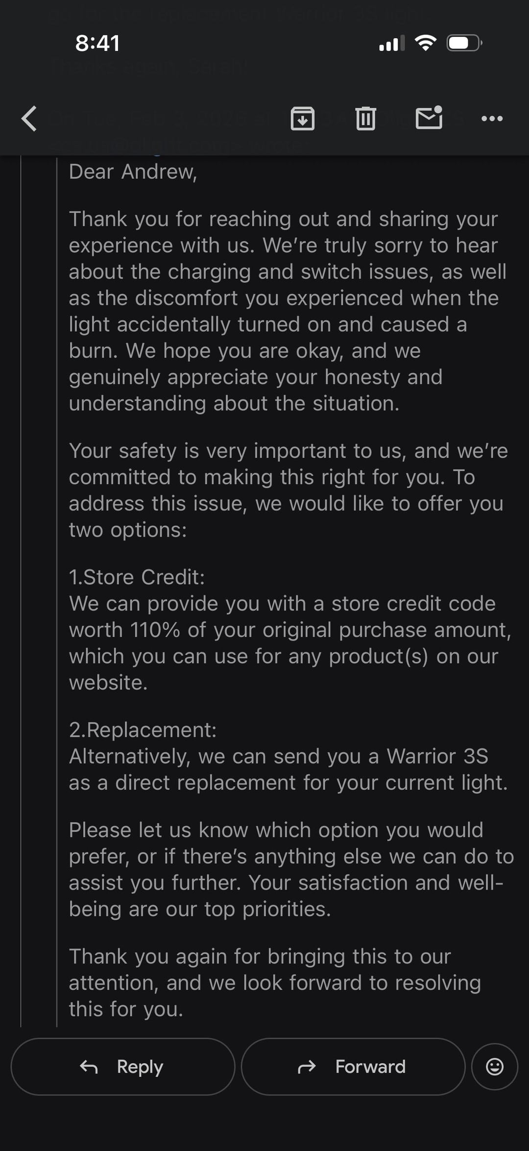 Can’t speak highly enough of the Olight warranty and customer service. I called them because I had a 4-5 year old Warrior that the tailswitch was acting up and the lens had melted on it from getting turned on not using the lock which subsequently burned me, which I old them was my own fault for not using the silicone cover the issued with the lights as part of a ‘recall’. Submitted a warranty claim online and got an email back same day. Offered me store credit of 110% of MSRP or the new Warrior 3S. I chose the Warrior 3S and had a new one on the way in under 24 hours. They also threw in a i1R2 keychain light for free!