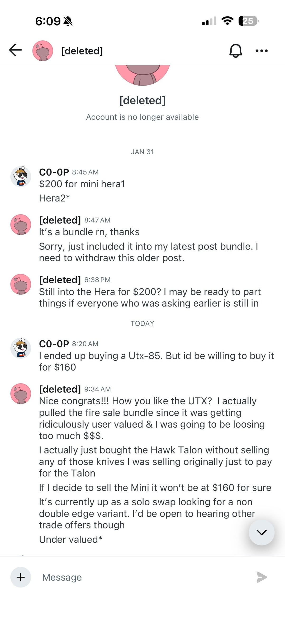 That’s bizarre to burn an established account on a sub that has amazing deals and can liquidate a knife collection in a matter of hours if you need to for less than $200.