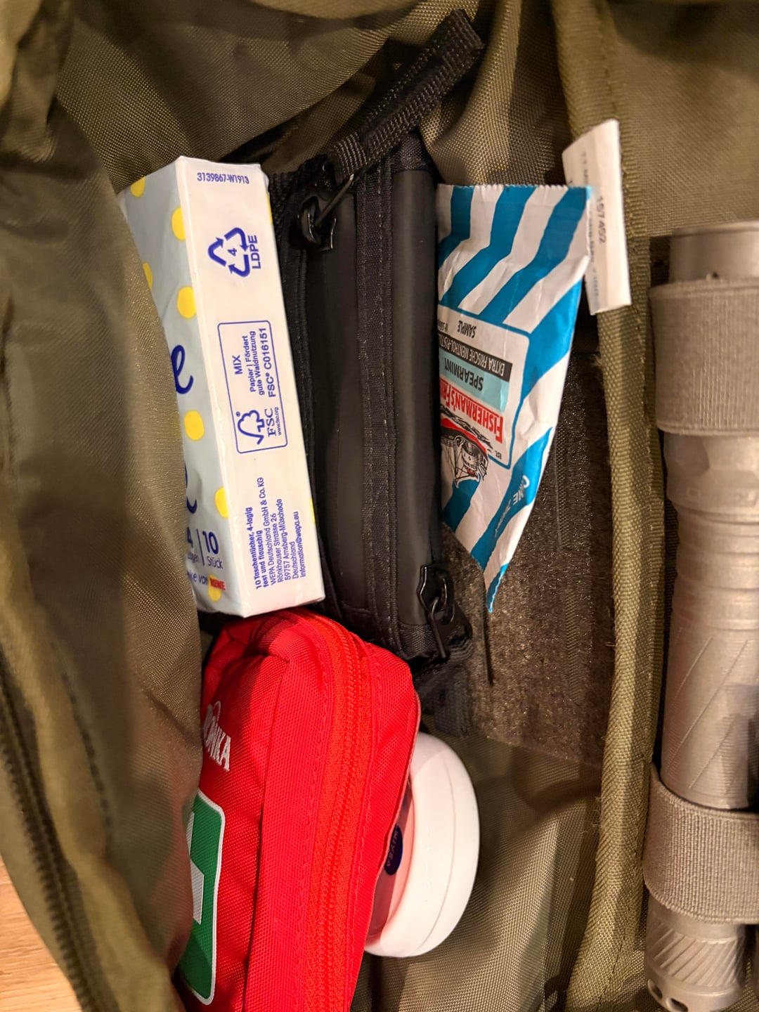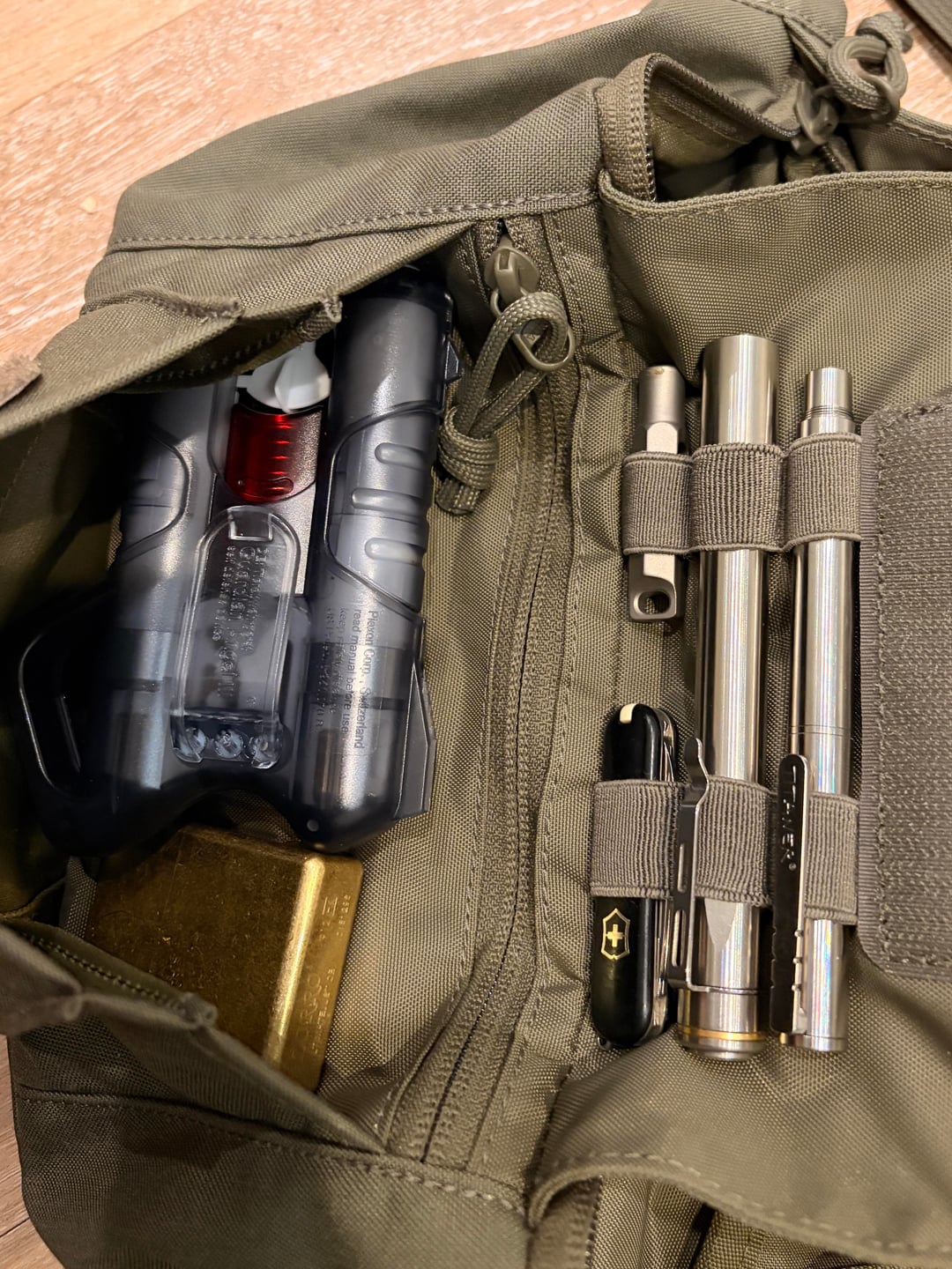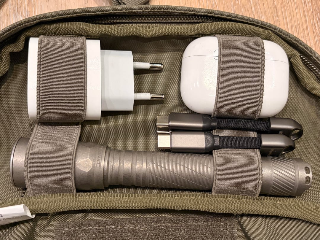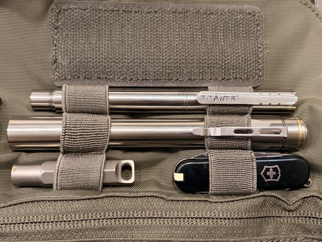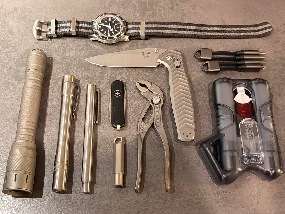 This thoughtfully curated Titanium EDC set is my constant companion, which I use frequently. I love titanium for its lightweight durability and chose most items from this material. It covers all key aspects: self-defense, sharp knife, first aid, miniature tool set with pliers, fire, music, light, mini charging cable, charger ✌🏻