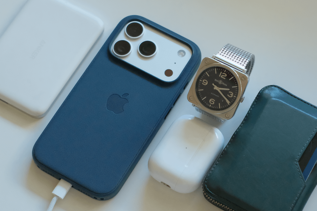 • iPhone 17 Pro (in Apple fabric-woven blue case)