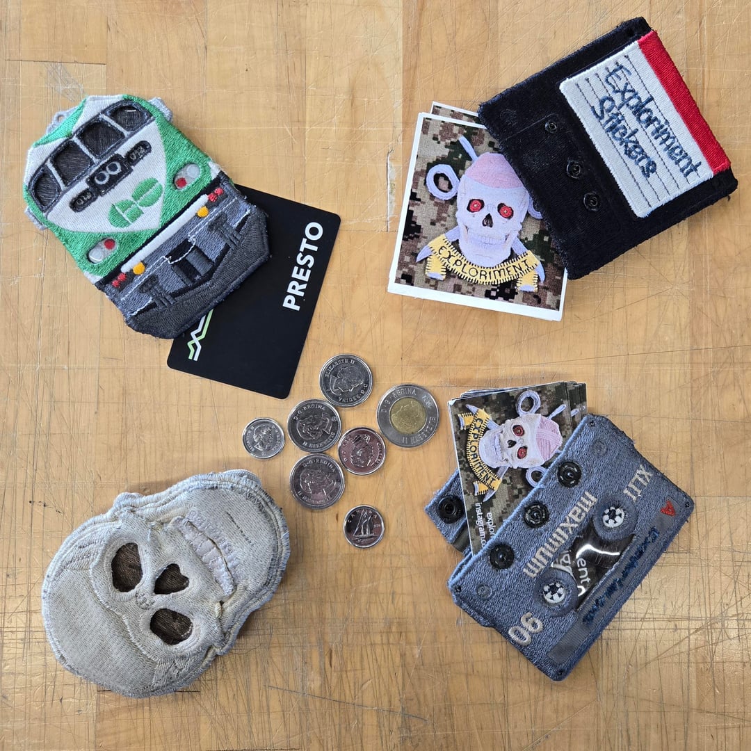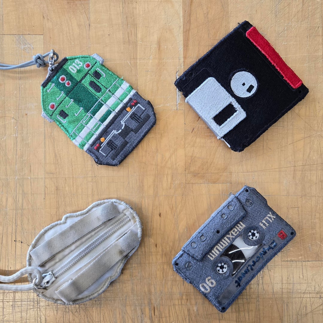 Some pouches I made. GO Transit locomotive Presto pass holder, 3.5" floppy disk sticker pouch, cassette business card pouch, and skull coin pouch.