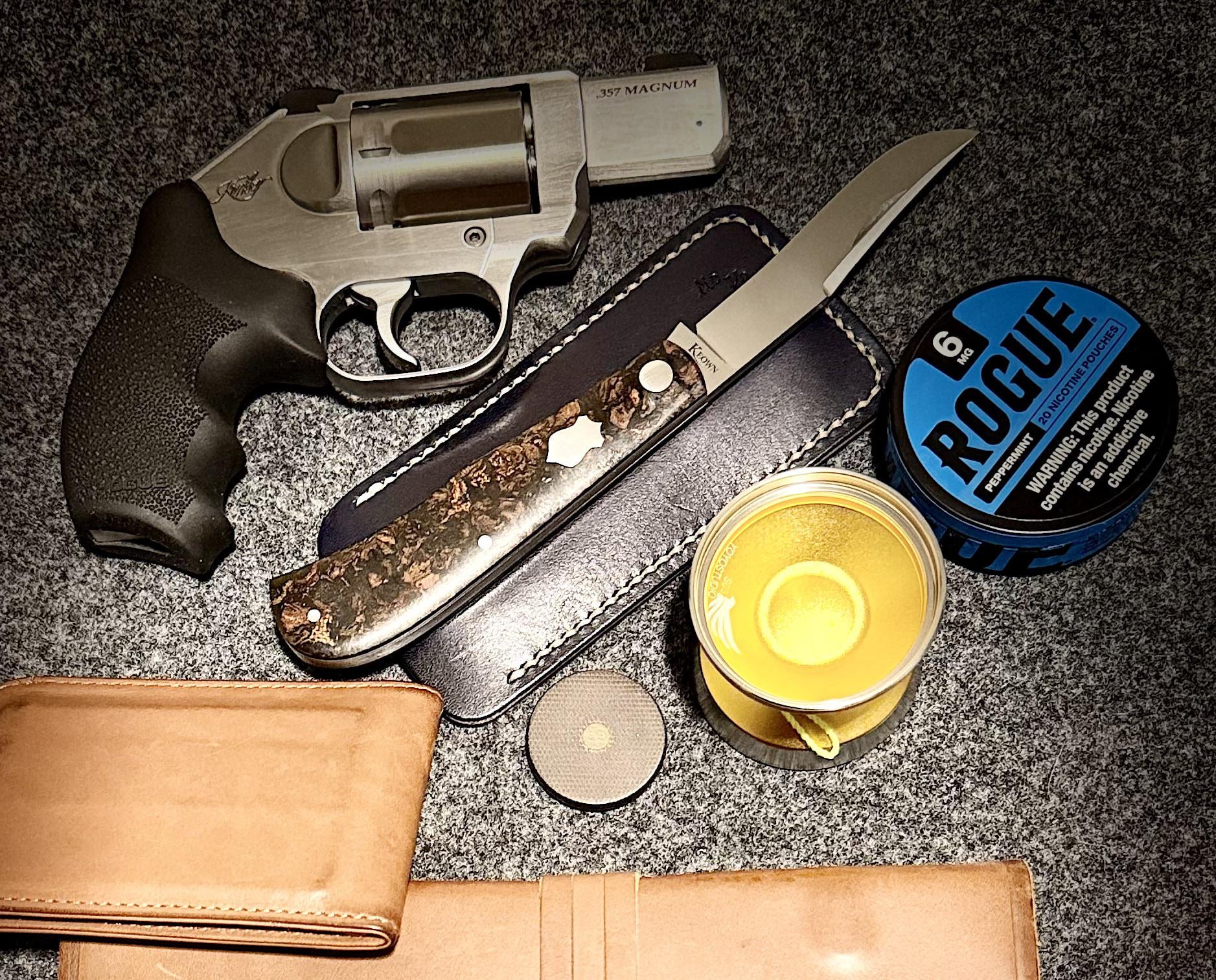 **Kimber K6s, Keown back pocket, Distil Union Wallie Bifold 5.0, some kind of Micarta coin, HW leather slip, Rogue 6mg, unresponsive yoyo, and ESV thinline.**