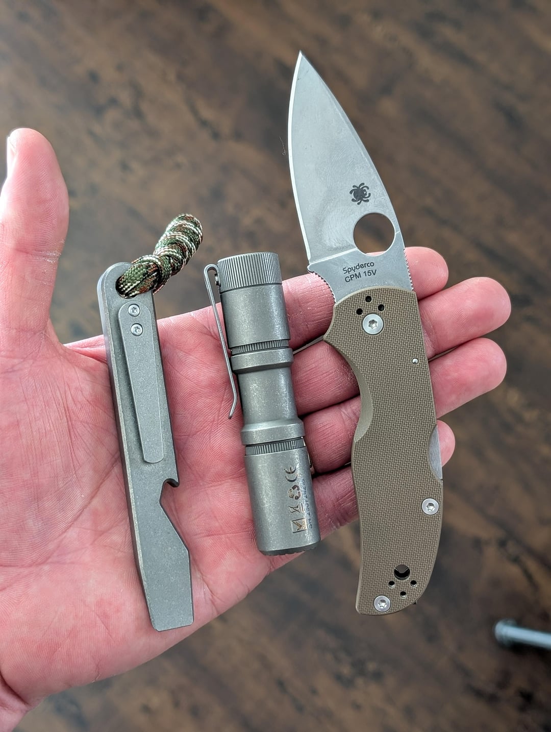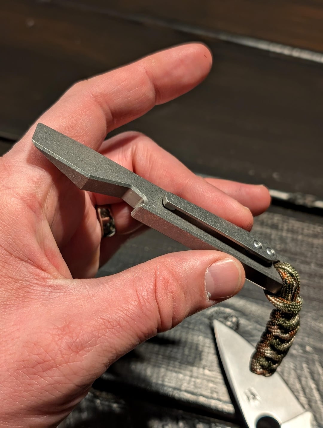 never really found one that I thought was for me until a few days ago. this thing is a perfect size for me… it's quality titanium, nice and sturdy, chamfered edges, nice clip, 1/4" bit holder (currently have a lanyard in it). so I thought I'd give it a run today opening paint cans and scraping some shit.